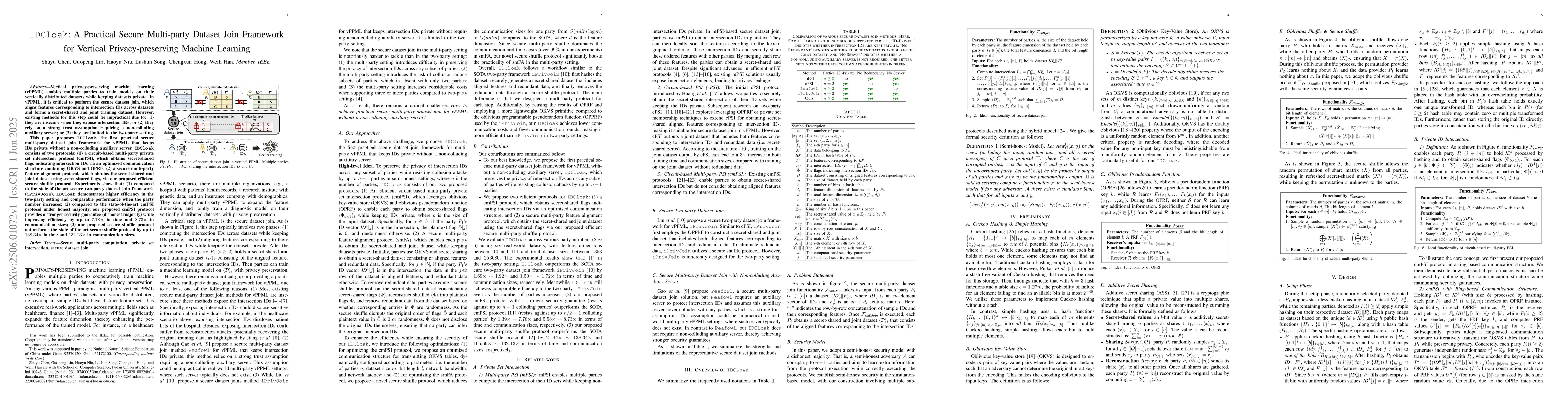 This paper introduces IDCloak, a secure multi-party dataset join framework for vertical privacy-preserving machine learning that keeps IDs private without an auxiliary server, offering improved efficiency and stronger security guarantees over existing methods.