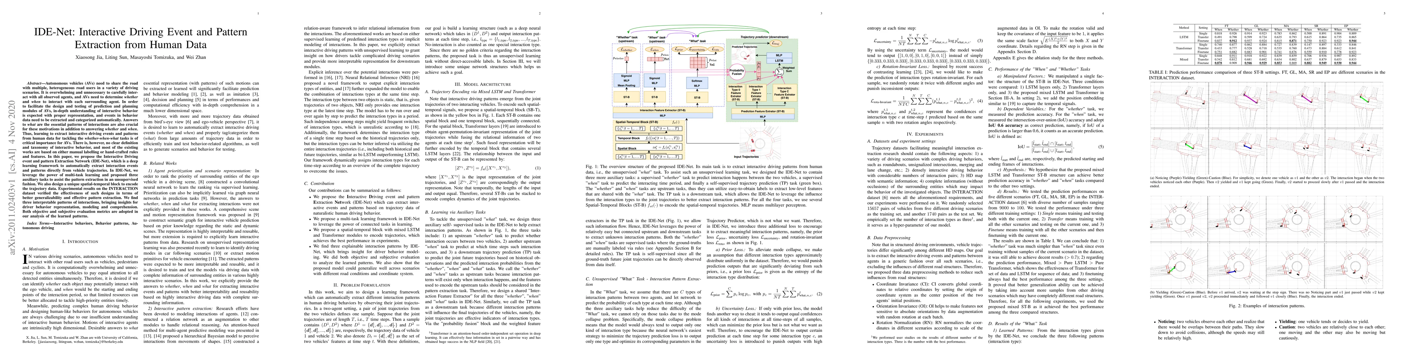 Autonomous vehicles (AVs) need to share the road with multiple, heterogeneous road users in a variety of driving scenarios. It is overwhelming and unnecessary to carefully interact with all observed agents, and AVs need to determine whether and when to interact with each surrounding agent. In order to facilitate the design and testing of prediction and planning modules of AVs, in-depth understanding of interactive behavior is expected with proper representation, and events in behavior data need to be extracted and categorized automatically. Answers to what are the essential patterns of interactions are also crucial for these motivations in addition to answering whether and when. Thus, learning to extract interactive driving events and patterns from human data for tackling the whether-when-what tasks is of critical importance for AVs. There is, however, no clear definition and taxonomy of interactive behavior, and most of the existing works are based on either manual labelling or hand-crafted rules and features. In this paper, we propose the Interactive Driving event and pattern Extraction Network (IDE-Net), which is a deep learning framework to automatically extract interaction events and patterns directly from vehicle trajectories. In IDE-Net, we leverage the power of multi-task learning and proposed three auxiliary tasks to assist the pattern extraction in an unsupervised fashion. We also design a unique spatial-temporal block to encode the trajectory data. Experimental results on the INTERACTION dataset verified the effectiveness of such designs in terms of better generalizability and effective pattern extraction. We find three interpretable patterns of interactions, bringing insights for driver behavior representation, modeling and comprehension. Both objective and subjective evaluation metrics are adopted in our analysis of the learned patterns.