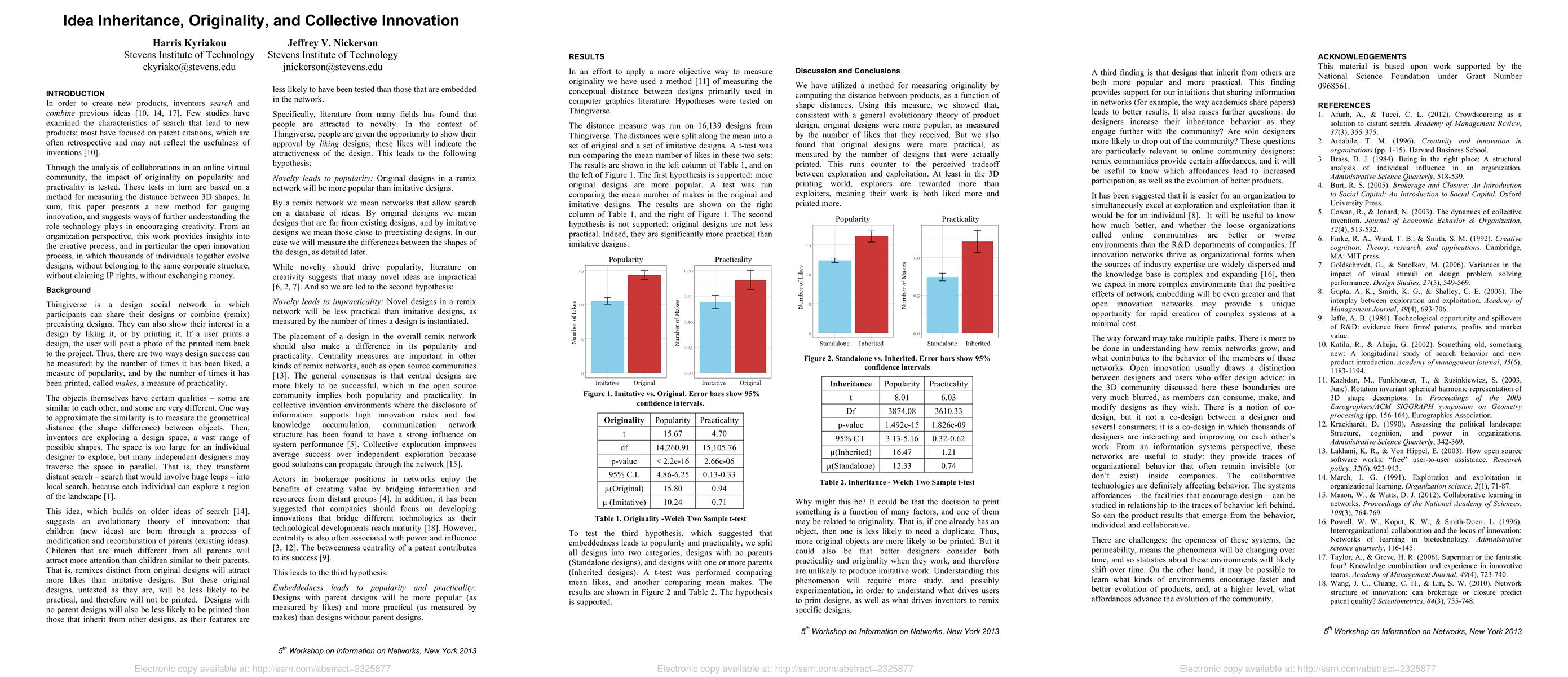 In order to create new products, inventors search and combine previous ideas. Few studies have examined the characteristics of search that lead to new products; most have focused on patent citations, which are often retrospective and may not reflect the usefulness of inventions. Through the analysis of collaborations in an online virtual community, the impact of originality on popularity and practicality is tested. These tests in turn are based on a method for measuring the distance between 3D shapes. In sum, this paper presents a new method for gauging innovation, and suggests ways of further understanding the role technology plays in encouraging creativity. From an organization perspective, this work provides insights into the creative process, and in particular the open innovation process, in which thousands of individuals together evolve designs, without belonging to the same corporate structure, without claiming IP rights, without exchanging money.