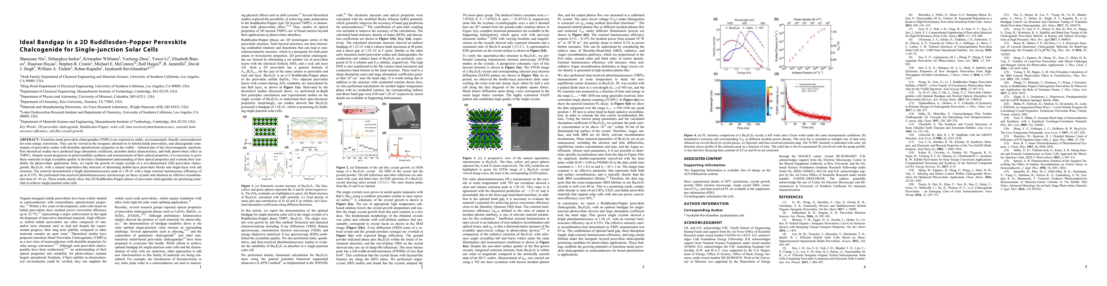 This paper investigates the optoelectronic properties of a 2D Ruddlesden-Popper perovskite chalcogenide, Ba3Zr2S7, grown as single crystals, revealing a bandgap of 1.28 eV and a high recombination time of ~65 ns, indicating its potential for single-junction solar cell applications.
