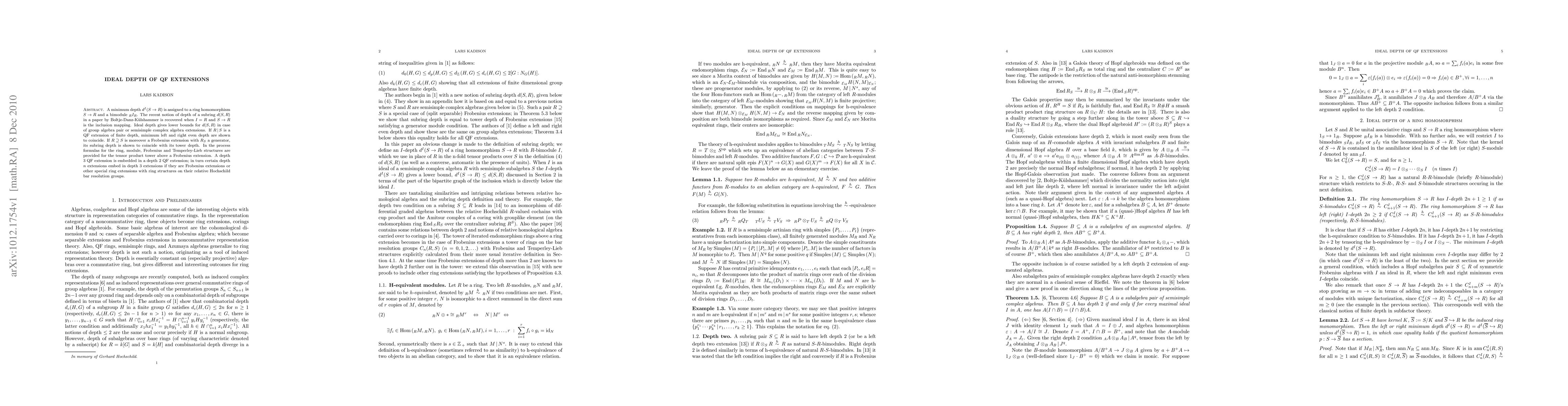 A minimum depth d^I(S --> R) is assigned to a ring homomorphism S --> R and a R-R-bimodule I. The recent notion of depth of a subring d(S,R)in a paper by Boltje-Danz-Kuelshammer is recovered when I = R and S --> R is the inclusion mapping. Ideal depth gives lower bounds for d(S,R) in case of group C-algebra pair or semisimple complex algebra extensions. If R | S is a QF extension of finite depth, minimum left and right even depth are shown to coincide. If R < S is moreover a Frobenius extension with R a right S-generator, its subring depth is shown to coincide with its tower depth. In the process formulas for the ring, module, Frobenius and Temperley-Lieb structures are provided for the tensor product tower above a Frobenius extension. A depth 3 QF extension is embedded in a depth 2 QF extension; in turn certain depth n extensions embed in depth 3 extensions if they are Frobenius extensions or other special ring extensions with ring structures on their relative Hochschild bar resolution groups.