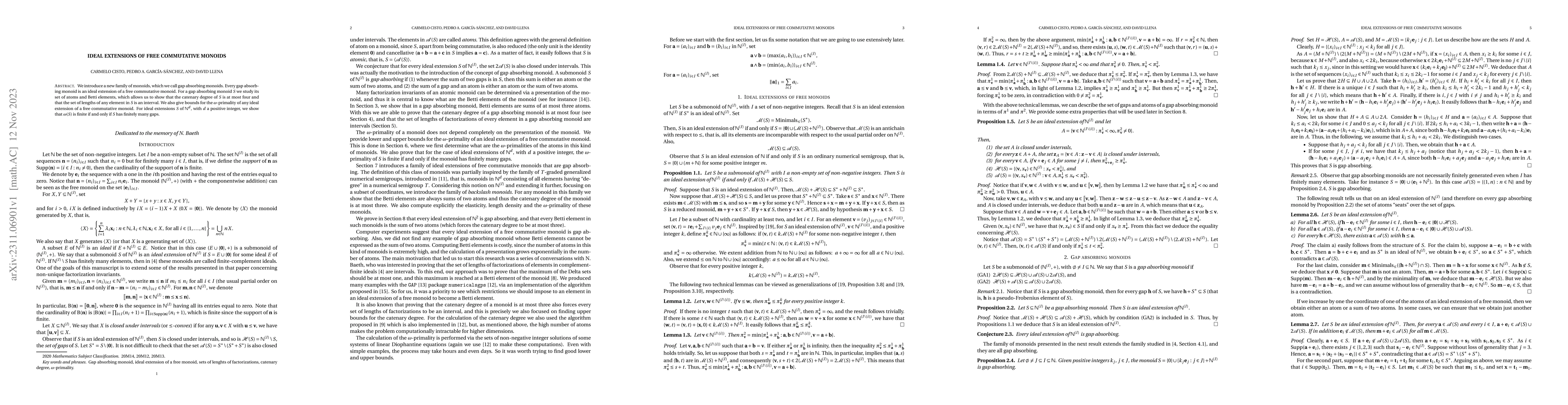 We introduce a new family of monoids, which we call gap absorbing monoids. Every gap absorbing monoid is an ideal extension of a free commutative monoid. For a gap absorbing monoid $S$ we study its set of atoms and Betti elements, which allows us to show that the catenary degree of $S$ is at most four and that the set of lengths of any element in $S$ is an interval. We also give bounds for the $\omega$-primality of any ideal extension of a free commutative monoid. For ideal extensions $S$ of $\mathbb{N}^d$, with $d$ a positive integer, we show that $\omega(S)$ is finite if and only if $S$ has finitely many gaps.