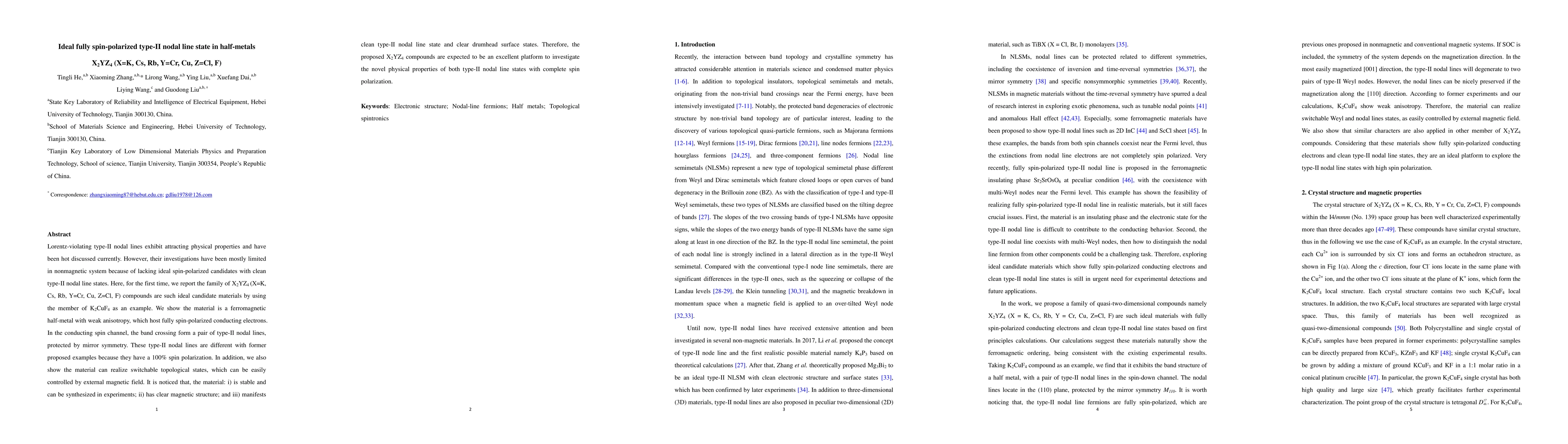This paper reports the discovery of a family of X2YZ4 compounds (X=K, Cs, Rb, Y=Cr, Cu, Z=Cl, F) that exhibit ideal fully spin-polarized type-II nodal line states in ferromagnetic half-metals. The material K2CuF4, as an example, demonstrates a clean type-II nodal line state with 100% spin polarization and switchable topological states controlled by external magnetic fields.
