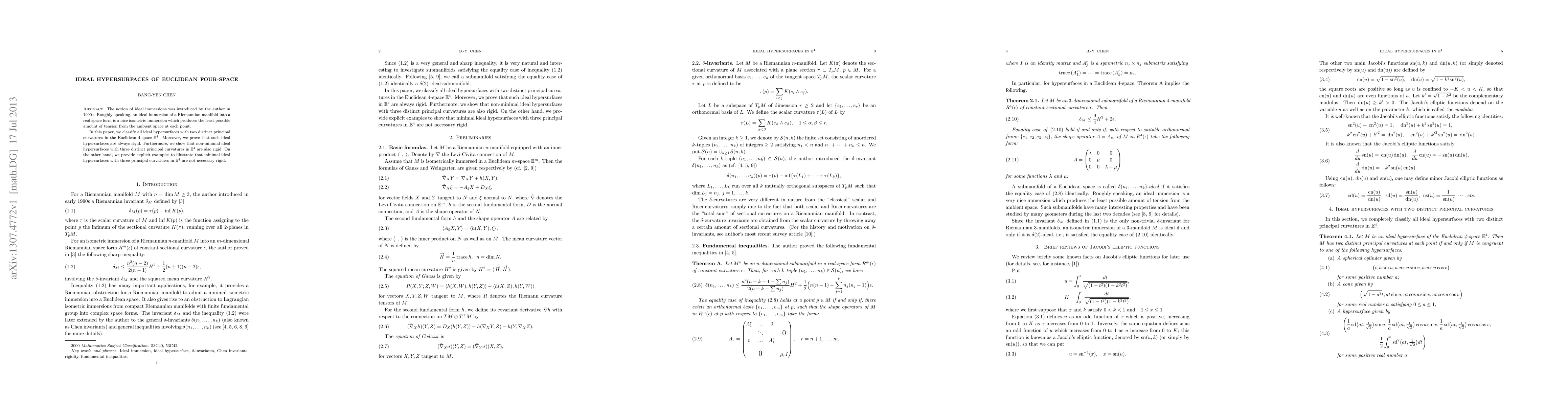 This paper classifies ideal hypersurfaces with two distinct principal curvatures in Euclidean four-space, proving their rigidity. It also shows that non-minimal ideal hypersurfaces with three distinct principal curvatures are rigid, while providing examples of minimal ones with three principal curvatures that are not necessarily rigid.