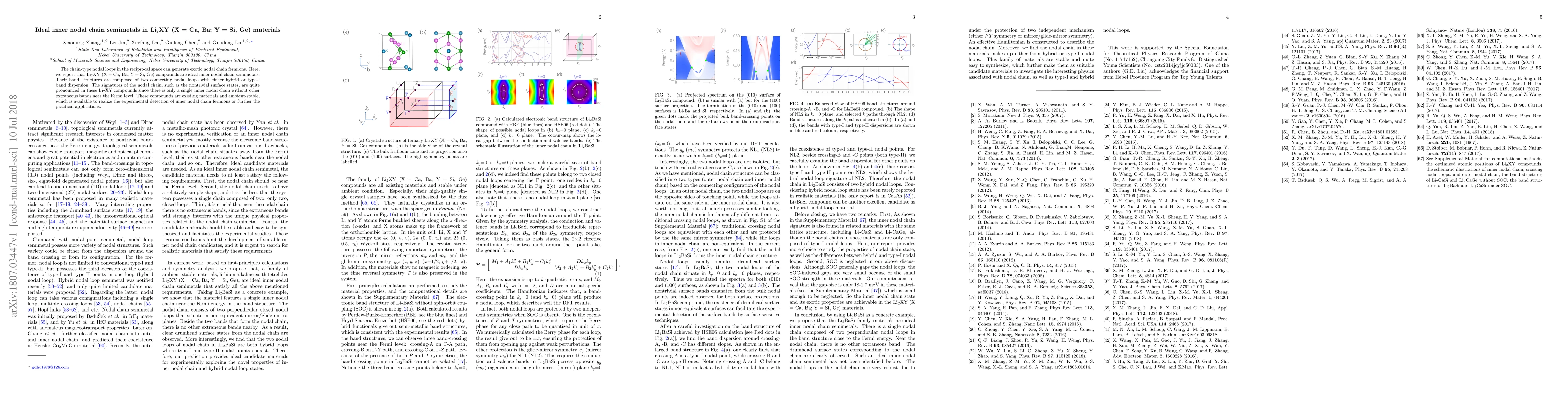 Li2XY (X = Ca, Ba; Y = Si, Ge) compounds are identified as ideal inner nodal chain semimetals with pronounced exotic nodal chain fermions, characterized by two connecting nodal loops in their band structures. These materials are ambient-stable and exhibit clear signatures of the nodal chain, making them suitable for experimental detection and potential practical applications.