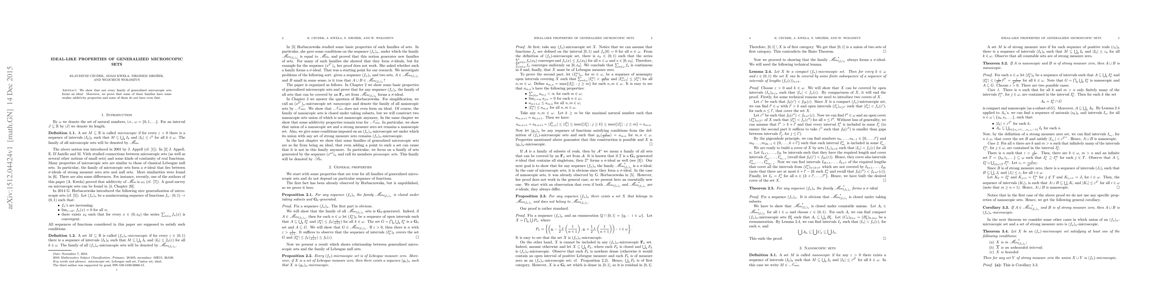 We show that not every family of generalized microscopic sets forms an ideal. Moreover, we prove that some of these families have some weaker additivity properties and some of them do not have even that.