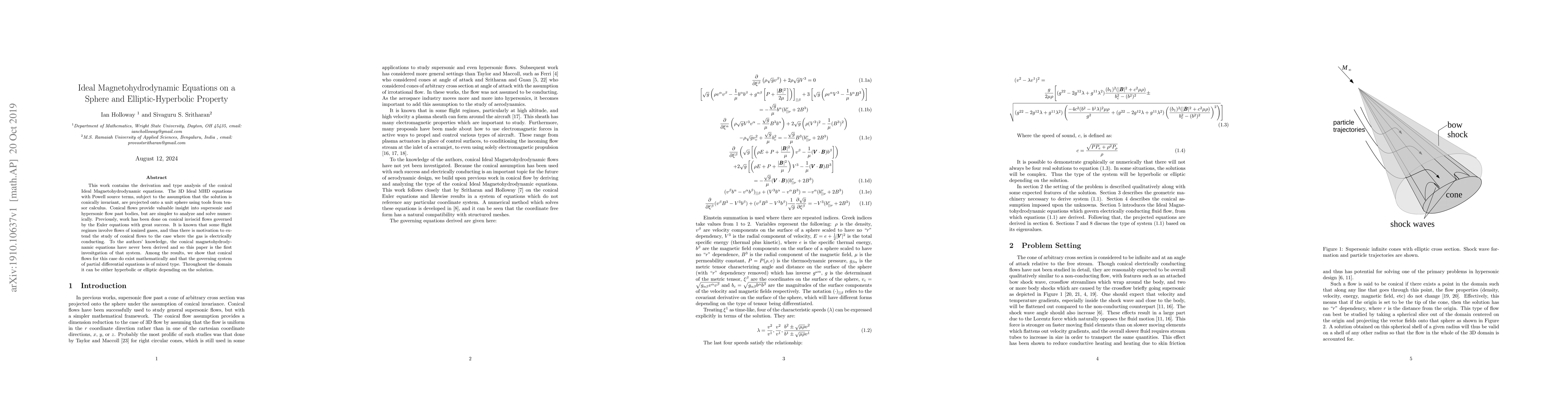 This work contains the derivation and type analysis of the conical Ideal Magnetohydrodynamic equations. The 3D Ideal MHD equations with Powell source terms, subject to the assumption that the solution is conically invariant, are projected onto a unit sphere using tools from tensor calculus. Conical flows provide valuable insight into supersonic and hypersonic flow past bodies, but are simpler to analyze and solve numerically. Previously, work has been done on conical inviscid flows governed by the Euler equations with great success. It is known that some flight regimes involve flows of ionized gases, and thus there is motivation to extend the study of conical flows to the case where the gas is electrically conducting. To the authors' knowledge, the conical magnetohydrodynamic equations have never been derived and so this paper is the first invesitgation of that system. Among the results, we show that conical flows for this case do exist mathematically and that the governing system of partial differential equations is of mixed type. Throughout the domain it can be either hyperbolic or elliptic depending on the solution.