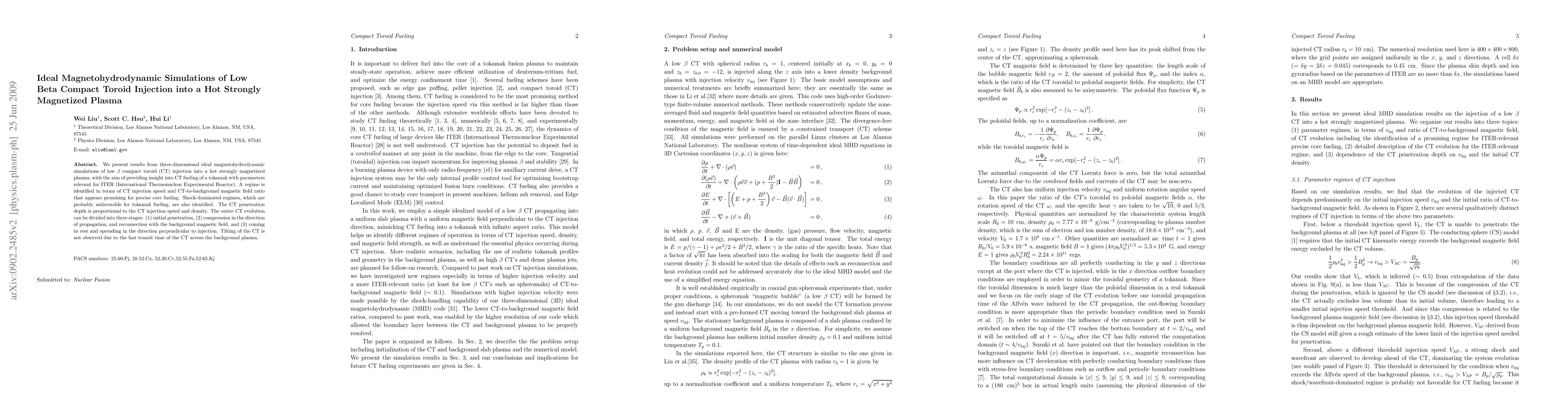 This paper presents ideal magnetohydrodynamic simulations of low beta compact toroid injection into hot magnetized plasma, identifying optimal conditions for precise core fueling in tokamaks like ITER. The study reveals three stages of CT evolution and highlights unfavorable shock-dominated regimes.