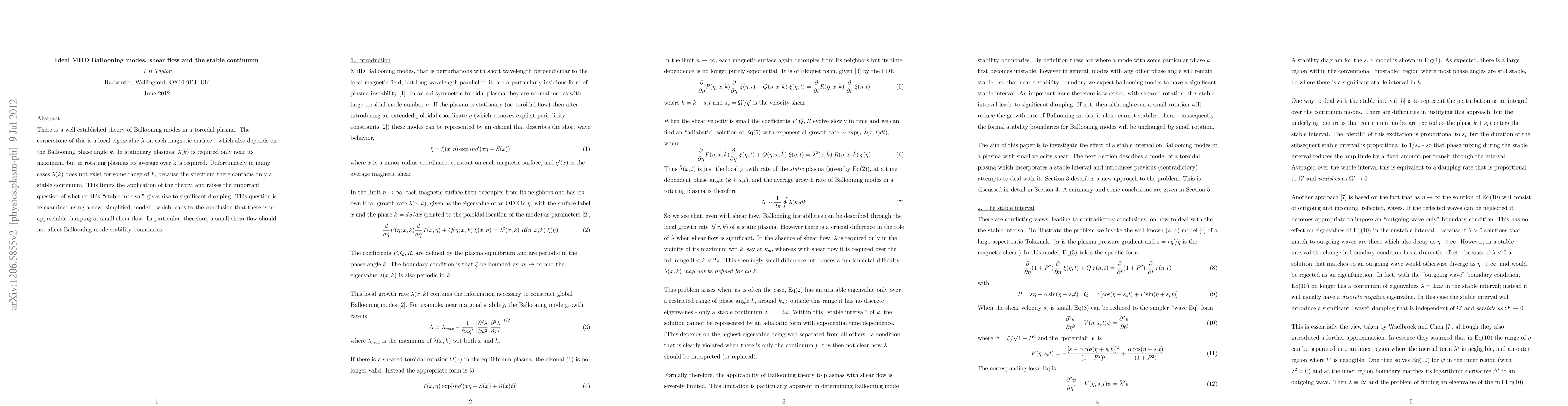 There is a well established theory of Ballooning modes in a toroidal plasma. The cornerstone of this is a local eigenvalue lambda on each magnetic surface - which also depends on the ballooning phase angle k. In stationary plasmas lambda(k) is required only near its maximum, but in rotating plasmas its average over k is required. Unfortunately in many case lambda(k) does not exist for some range of k, because the spectrum there contains only a stable continuum. This limits the application of the theory, and raises the important question of whether this "stable interval" gives rise to significant damping. This question is re-examined using a new, simplified, model - which leads to the conclusion that there is no appreciable damping at small shear flow. In particular, therefore, a small shear flow should not affect Ballooning mode stability boundaries.