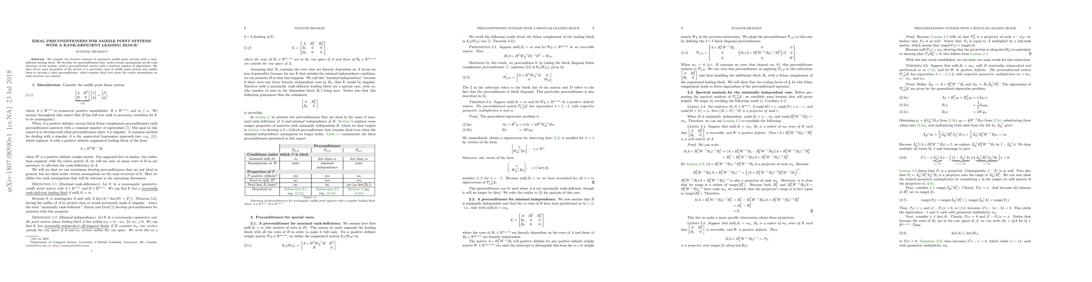 This paper develops preconditioners for solving symmetric saddle point systems with a rank-deficient leading block, introducing two initial preconditioners that maintain a constant eigenvalue count, and a third preconditioner that remains ideal even with relaxed rank structure assumptions.
