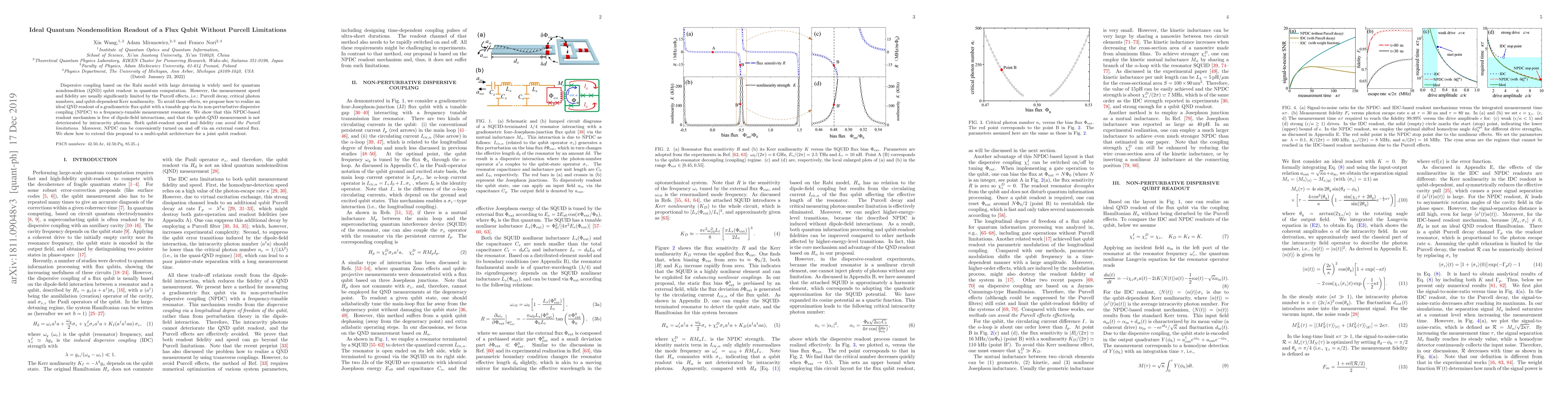 The research proposes a method for ideal quantum nondemolition (QND) readout of a gradiometric flux qubit, utilizing non-perturbative dispersive coupling (NPDC) with a tunable gap to a frequency-tunable measurement resonator, avoiding Purcell limitations and dipole-field interactions.