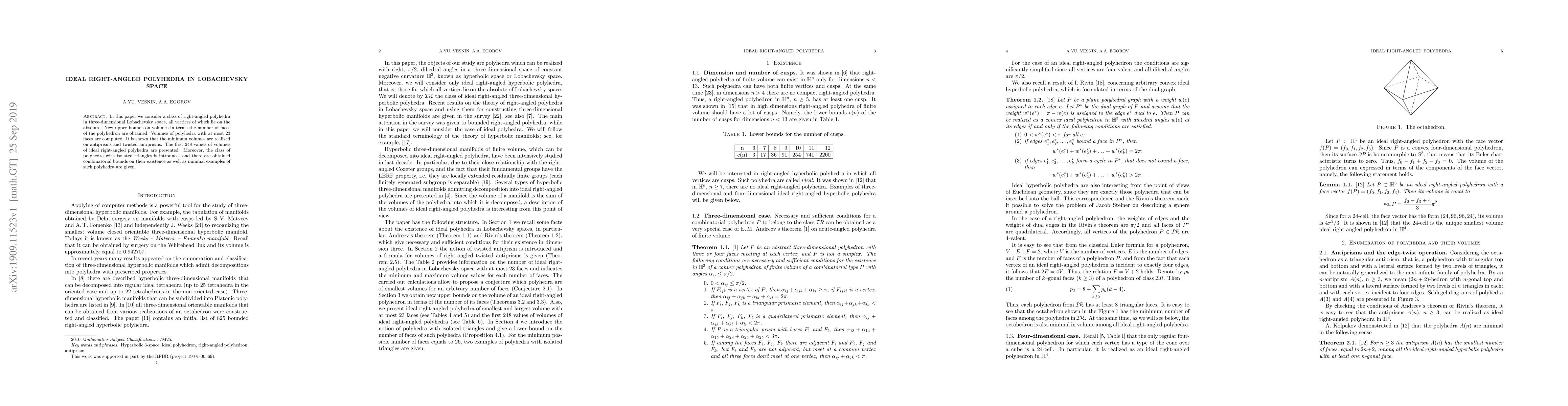 This paper investigates right-angled polyhedra in three-dimensional Lobachevsky space, establishing new upper bounds on their volumes based on the number of faces. It computes the volumes of polyhedra with up to 23 faces, showing that minimum volumes occur in antiprisms and twisted antiprisms, and presents the first 248 values of such volumes. Additionally, it introduces polyhedra with isolated triangles and provides combinatorial bounds on their existence.