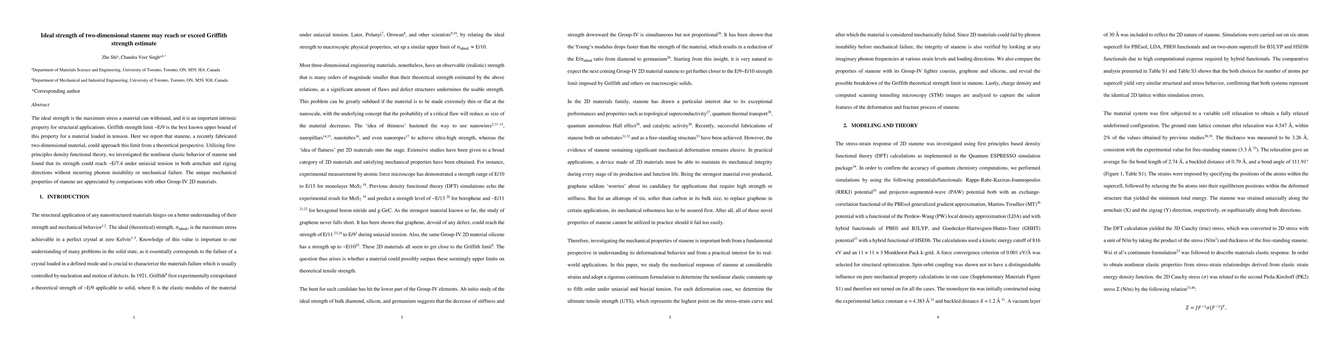 Researchers found that stanene, a 2D material, can approach or exceed the theoretical maximum strength limit of ~E/9, with a strength of up to ~E/7.4 under uniaxial tension.
