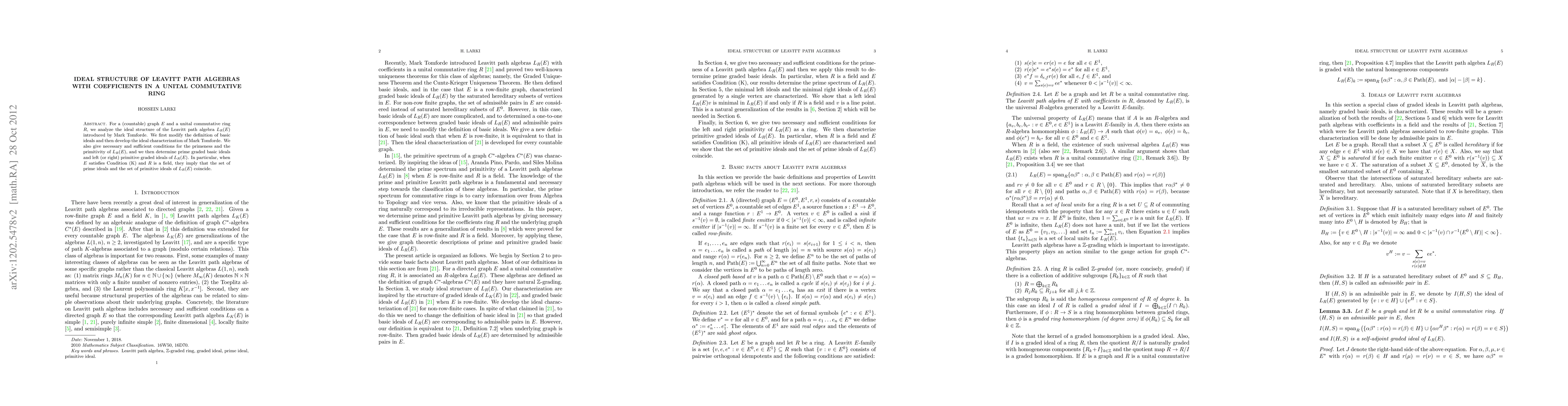 This paper examines the ideal structure of Leavitt path algebras over a unital commutative ring, modifying basic ideals and providing conditions for primeness and primitivity. It determines prime and primitive graded ideals, showing that under certain conditions, prime and primitive ideals coincide.