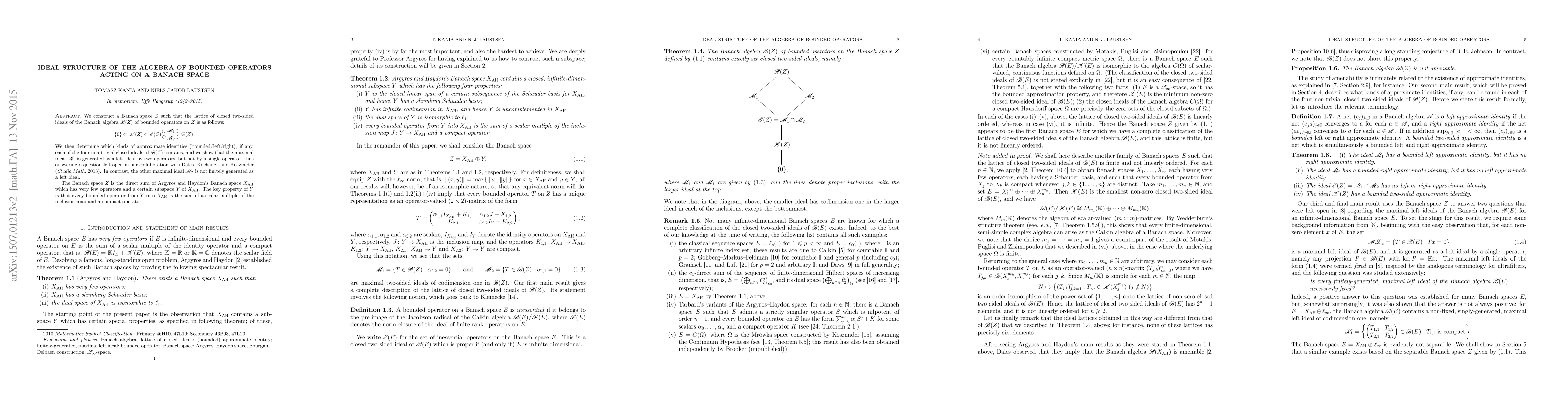 We construct a Banach space $Z$ such that the lattice of closed two-sided ideals of the Banach algebra $\mathscr{B}(Z)$ of bounded operators on $Z$ is as follows: $$ \{0\}\subset \mathscr{K}(Z)\subset\mathscr{E}(Z) \raisebox{-.5ex}% {\ensuremath{\overset{\begin{turn}{30}$\subset$\end{turn}}% {\begin{turn}{-30}$\subset$\end{turn}}}}\!\!% \begin{array}{c}\mathscr{M}_1\\[1mm]\mathscr{M}_2\end{array}\!\!\!% \raisebox{-1.25ex}% {\ensuremath{\overset{\raisebox{1.25ex}{\ensuremath{\begin{turn}{-30}$\subset$\end{turn}}}}% {\raisebox{-.25ex}{\ensuremath{\begin{turn}{30}$\subset$\end{turn}}}}}}\,\mathscr{B}(Z) $$ We then determine which kinds of approximate identities (bounded/left/right), if any, each of the four non-trivial closed ideals of $\mathscr{B}(Z)$ contain, and we show that the maximal ideal $\mathscr{M}_1$ is generated as a left ideal by two operators, but not by a single operator, thus answering a question left open in our collaboration with Dales, Kochanek and Koszmider (\emph{Studia Math.} 2013). In contrast, the other maximal ideal $\mathscr{M}_2$ is not finitely generated as a left ideal. The Banach space $Z$ is the direct sum of Argyros and Haydon's Banach space $X_{\text{AH}}$ which has very few operators and a certain subspace $Y$ of $X_{\text{AH}}$. The key property of~$Y$ is that every bounded operator from $Y$ into $X_{\text{AH}}$ is the sum of a scalar multiple of the inclusion mapping and a compact operator.