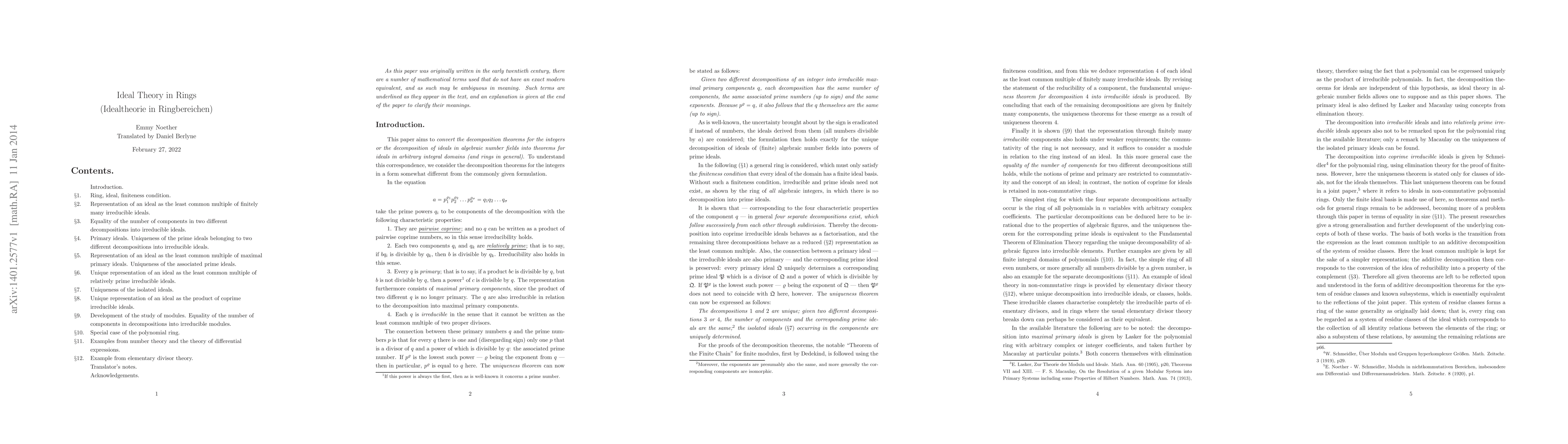 This paper is a translation of the paper "Idealtheorie in Ringbereichen", written by Emmy Noether in 1920, from the original German into English. It in particular brings the language used into the modern world so that it is easily understandable by the mathematicians of today. The paper itself deals with ideal theory, and was revolutionary in its field, that is modern algebra. Topics covered include: the representation of an ideal as the least common multiple of irreducible ideals; the representation of an ideal as the least common multiple of maximal primary ideals; the association of prime ideals with primary ideals; the representation of an ideal as the least common multiple of relatively prime irreducible ideals; isolated ideals; the representation of an ideal as the product of coprime irreducible ideals; equivalent concepts regarding modules.