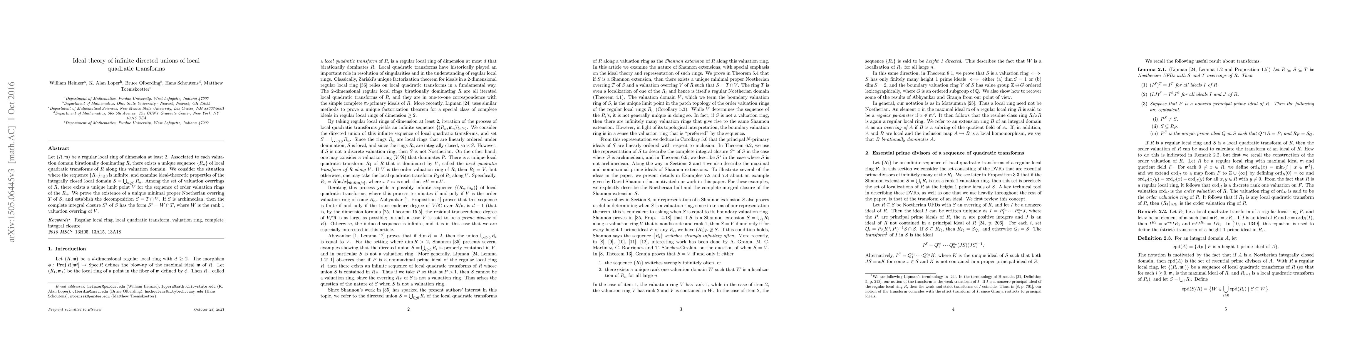 Let $R$ be a regular local ring of dimension at least 2. Associated to each valuation domain birationally dominating $R$, there exists a unique sequence $\{R_n\}$ of local quadratic transforms of $R$ along this valuation domain. We consider the situation where the sequence $\{ R_n \}_{n \ge 0}$ is infinite, and examine ideal-theoretic properties of the integrally closed local domain $S = \bigcup_{n \ge 0} R_n$. Among the set of valuation overrings of $R$, there exists a unique limit point $V$ for the sequence of order valuation rings of the $R_n$. We prove the existence of a unique minimal proper Noetherian overring $T$ of $S$, and establish the decomposition $S = T \cap V$. If $S$ is archimedian, then the complete integral closure $S^{*}$ of $S$ has the form $S^{*} = W \cap T$, where $W$ is the rank $1$ valuation overring of $V$.