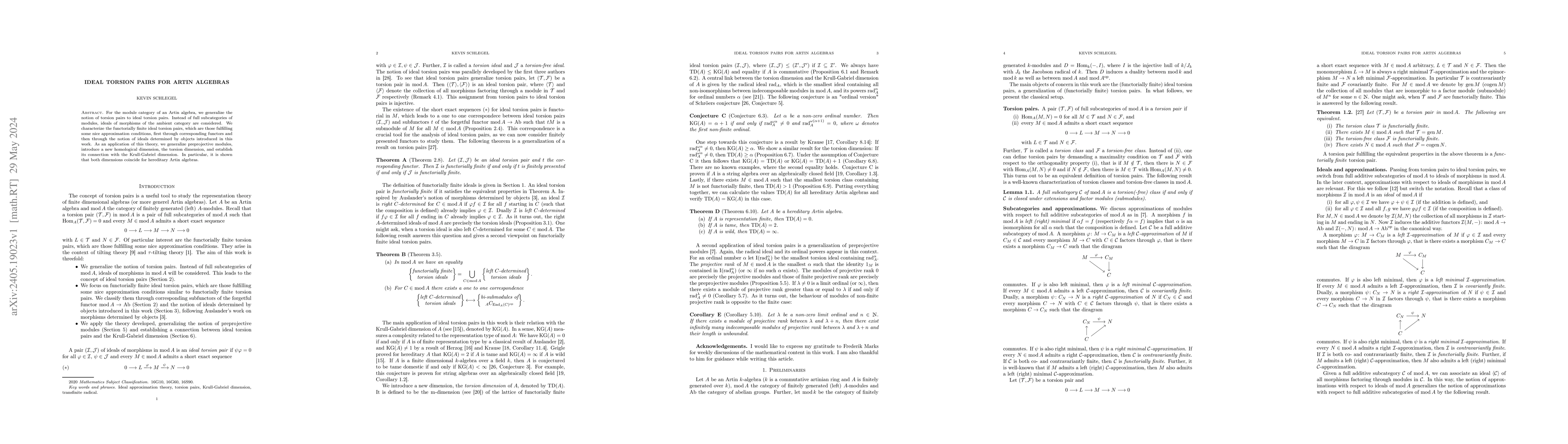 This paper generalizes torsion pairs in the module category of Artin algebras to ideal torsion pairs involving morphisms, characterizes functorially finite ideal torsion pairs, and applies this theory to generalize preprojective modules, introducing a new homological dimension called torsion dimension that matches the Krull-Gabriel dimension for hereditary Artin algebras.