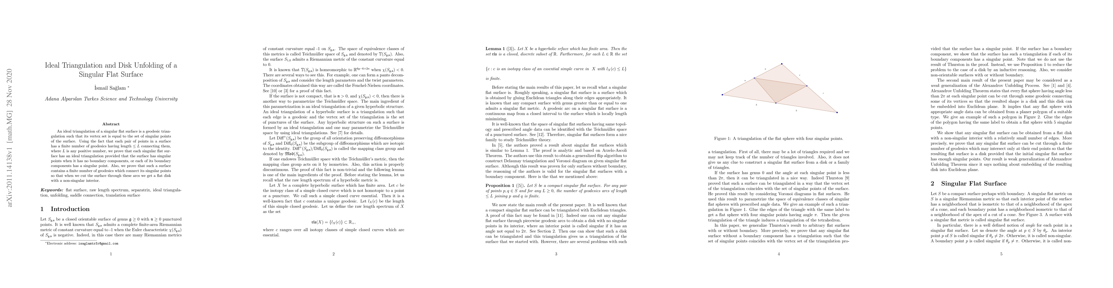This paper proves the existence of an ideal triangulation for singular flat surfaces, where vertices correspond to singular points, and demonstrates that such surfaces can be unfolded into a flat disk by cutting along a finite number of geodesics connecting these singular points.