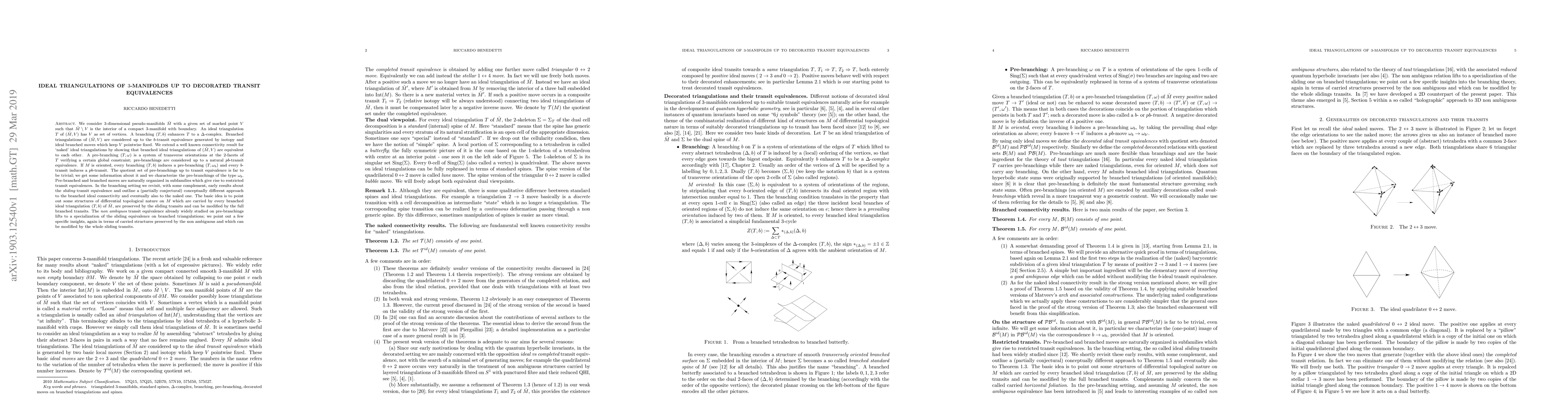 We consider 3-dimensional pseudo-manifolds M with a given set of marked point V such that M-V is the interior of a compact 3-manifold with boundary. An ideal triangulation T of (M, V ) has V as its set of vertices. A branching (T, b) enhances T to a Delta-complex. Branched triangulations of (M, V ) are considered up to the b-transit equivalence generated by isotopy and ideal branched moves which keep V pointwise fixed. We extend a well known connectivity result for naked triangulations by showing that branched ideal triangulations of (M, V) are equivalent to each other. A pre-branching is a system of transverse orientations at the 2-facets of T verifying a certain global constraint; pre-branchings are considered up to a natural pb-transit equivalence. If M is oriented, every branching b induces a pre-branching w(b) and every b-transit induces a pb-transit. The quotient set of pre-branchings up to transit equivalence is far to be trivial; we get some information about it and we characterize the pre-branchings of type w(b). Pre-branched and branched moves are naturally organized in subfamilies which give rise to restricted transit equivalences. In the branching setting we revisit early results about the sliding transit equivalence and outline a conceptually different approach to the branched connectivity and eventually also to the naked one. The basic idea is to point out some structures of differential topological nature which are carried by every branched ideal triangulation, are preserved by the sliding transits and can be modified by the whole branched transits. The non ambiguous transit equivalence already widely studied on pre-branchings lifts to a specialization of the sliding equivalence on branchings; we point out a few specific insights, again in terms of carried structures preserved by the non ambiguous and which can be modified by the whole sliding transits.