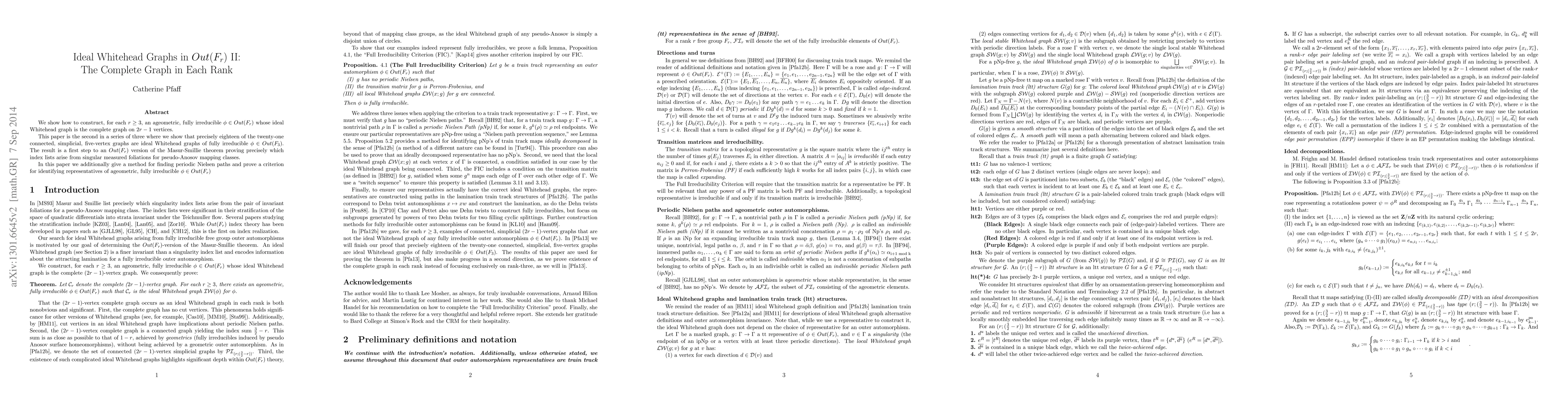 We show how to construct, for each $r \geq 3$, an ageometric, fully irreducible $\phi\in Out(F_r)$ whose ideal Whitehead graph is the complete graph on $2r-1$ vertices. This paper is the second in a series of three where we show that precisely eighteen of the twenty-one connected, simplicial, five-vertex graphs are ideal Whitehead graphs of fully irreducible $\phi \in Out(F_3)$. The result is a first step to an $Out(F_r)$ version of the Masur-Smillie theorem proving precisely which index lists arise from singular measured foliations for pseudo-Anosov mapping classes. In this paper we additionally give a method for finding periodic Nielsen paths and prove a criterion for identifying representatives of ageometric, fully irreducible $\phi\in Out(F_r)$