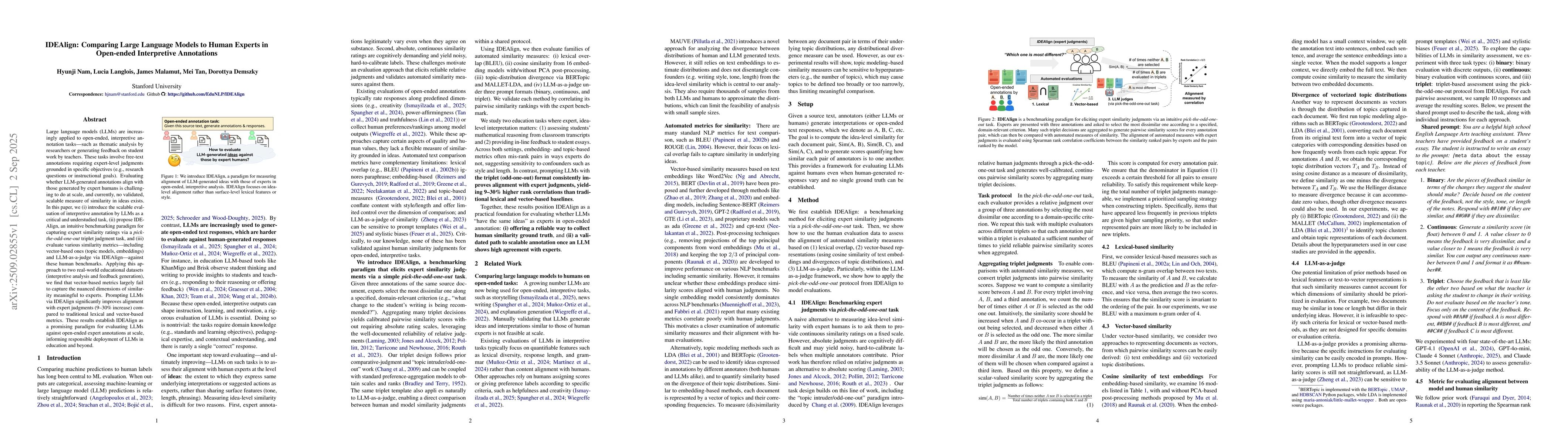 Large language models (LLMs) are increasingly applied to open-ended, interpretive annotation tasks, such as thematic analysis by researchers or generating feedback on student work by teachers. These tasks involve free-text annotations requiring expert-level judgments grounded in specific objectives (e.g., research questions or instructional goals). Evaluating whether LLM-generated annotations align with those generated by expert humans is challenging to do at scale, and currently, no validated, scalable measure of similarity in ideas exists. In this paper, we (i) introduce the scalable evaluation of interpretive annotation by LLMs as a critical and understudied task, (ii) propose IDEAlgin, an intuitive benchmarking paradigm for capturing expert similarity ratings via a "pick-the-odd-one-out" triplet judgment task, and (iii) evaluate various similarity metrics, including vector-based ones (topic models, embeddings) and LLM-as-a-judge via IDEAlgin, against these human benchmarks. Applying this approach to two real-world educational datasets (interpretive analysis and feedback generation), we find that vector-based metrics largely fail to capture the nuanced dimensions of similarity meaningful to experts. Prompting LLMs via IDEAlgin significantly improves alignment with expert judgments (9-30% increase) compared to traditional lexical and vector-based metrics. These results establish IDEAlgin as a promising paradigm for evaluating LLMs against open-ended expert annotations at scale, informing responsible deployment of LLMs in education and beyond.