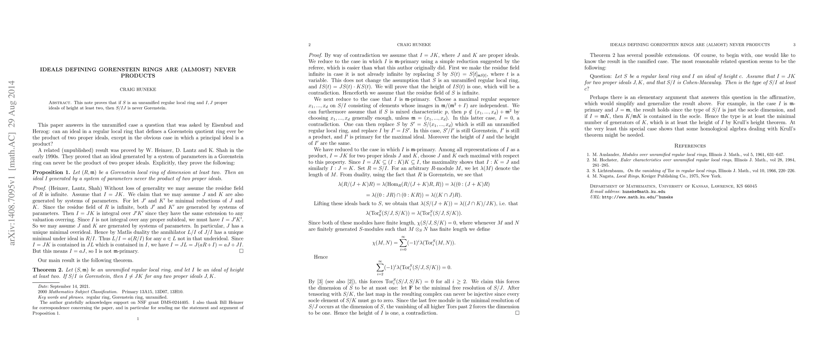 This note proves that if S is an unramified regular local ring and I and J are proper ideals of height at least two, then S/IJ is never Gorenstein.