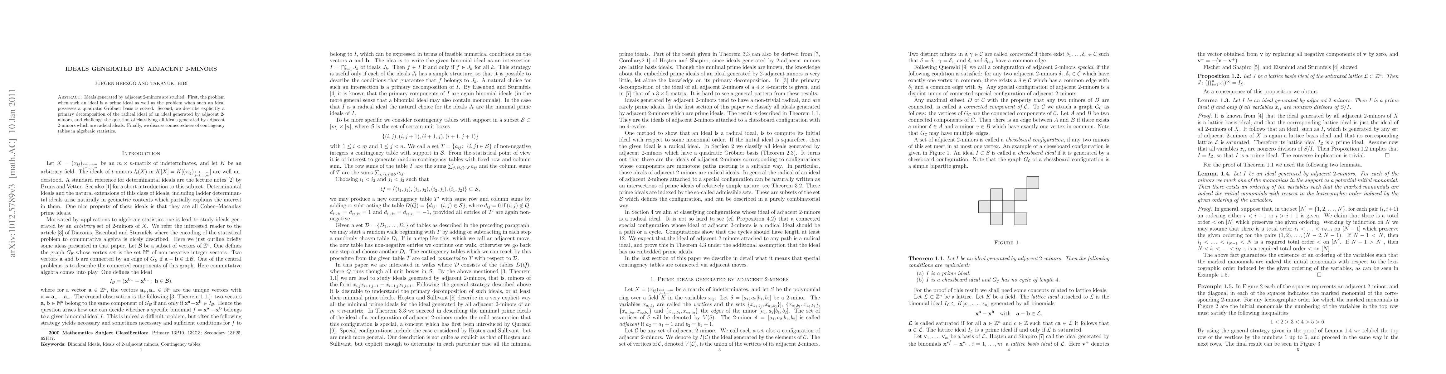 This paper studies ideals generated by adjacent 2-minors, solving when such ideals are prime and possess quadratic Gröbner bases. It provides an explicit primary decomposition of the radical ideal of these minors and poses the classification challenge for radical ideals generated by them, also linking to algebraic statistics on contingency tables.