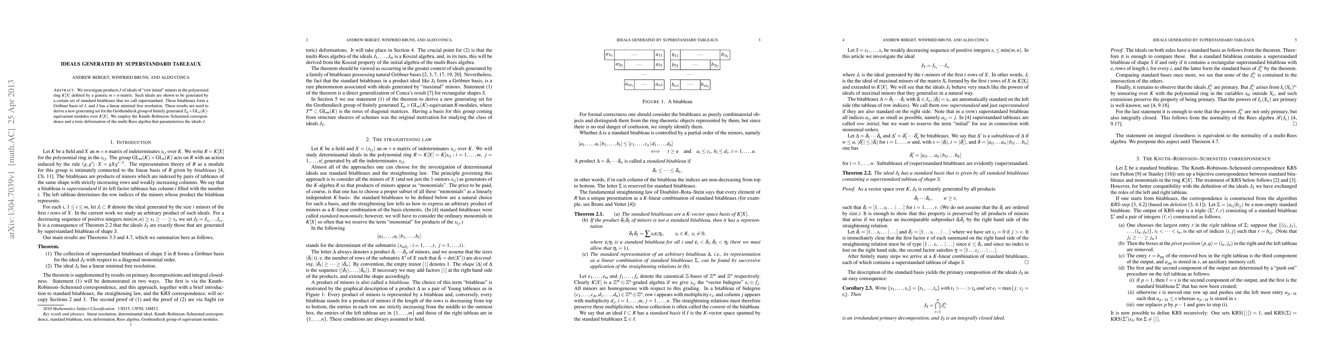 We investigate products J of ideals of "row initial" minors in the polynomial ring K[X] defined by a generic m-by-n matrix. Such ideals are shown to be generated by a certain set of standard bitableaux that we call superstandard. These bitableaux form a Gr\"obner basis of J, and J has a linear minimal free resolution. These results are used to derive a new generating set for the Grothendieck group of finitely generated (T_m x GL_n(K))-equivariant modules over K[X]. We employ the Knuth--Robinson--Schensted correspondence and a toric deformation of the multi-Rees algebra that parameterizes the ideals J.