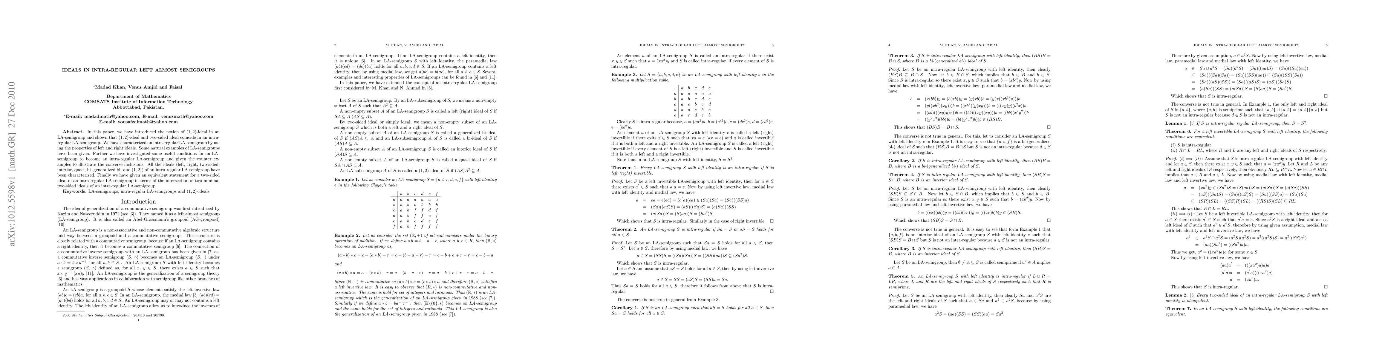 This paper introduces the concept of (1,2)-ideal in intra-regular left almost semigroups (LA-semigroups) and demonstrates that (1,2)-ideals coincide with two-sided ideals in such structures. It characterizes intra-regular LA-semigroups using left and right ideals and provides natural examples, along with conditions and counterexamples for LA-semigroups becoming intra-regular.