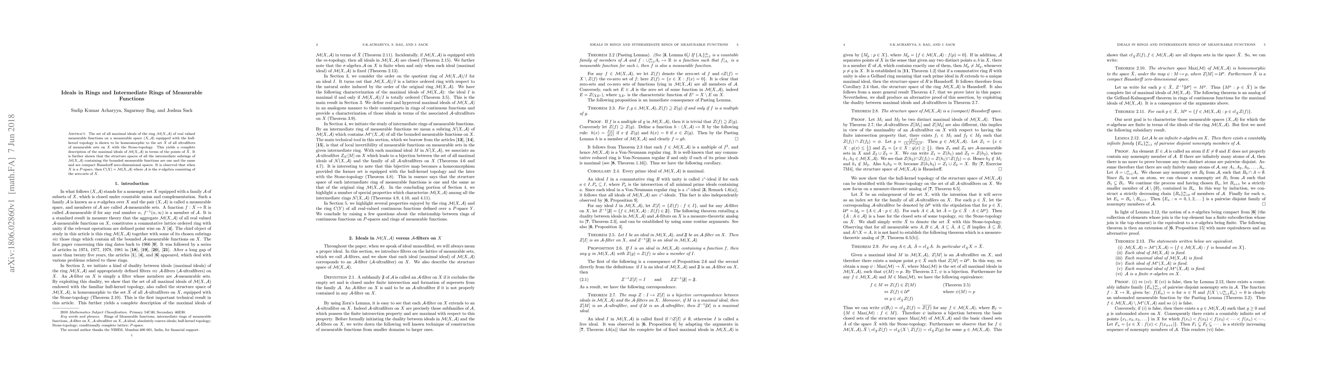 This paper establishes a homeomorphism between maximal ideals of measurable functions and ultrafilters on the underlying space, providing a complete description of these ideals in terms of points in the ultrafilter space. It also shows that intermediate subrings of certain measurable function rings have a single structure space that is compact Hausdorff zero-dimensional.
