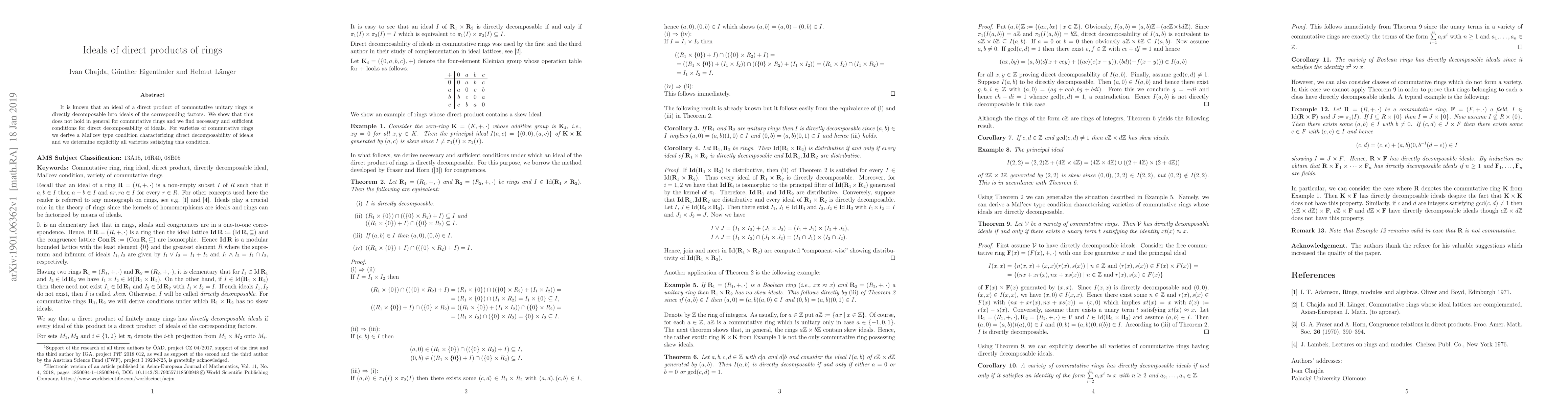 It is known that an ideal of a direct product of commutative unitary rings is directly decomposable into ideals of the corresponding factors. We show that this does not hold in general for commutative rings and we find necessary and sufficient conditions for direct decomposability of ideals. For varieties of commutative rings we derive a Mal'cev type condition characterizing direct decomposability of ideals and we determine explicitly all varieties satisfying this condition.