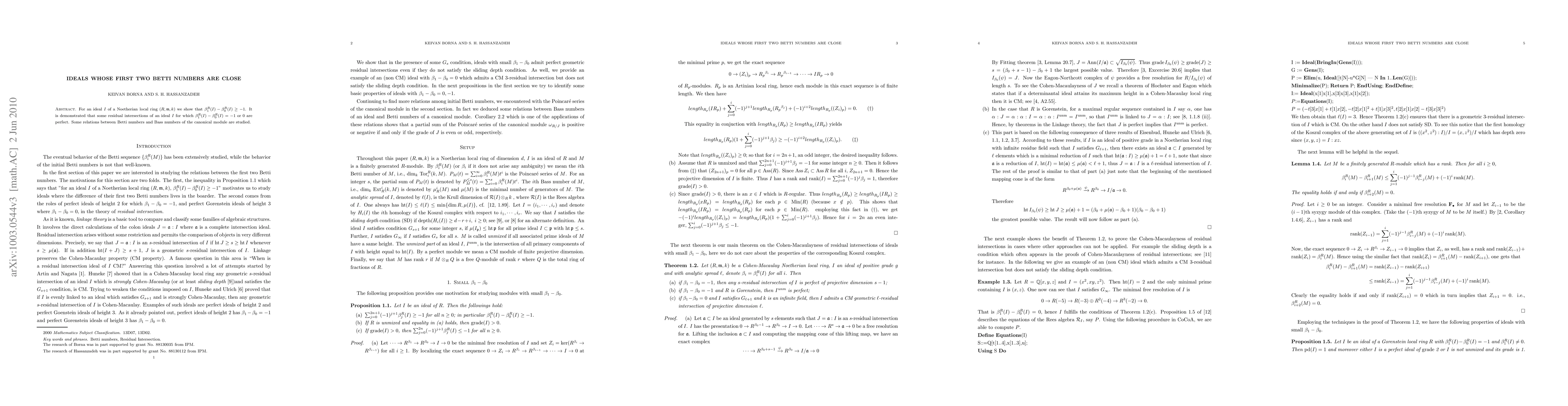 For an ideal $I$ of a Noetherian local ring $(R,\fm,k)$ we show that $\bt_1^R(I)-\bt_0^R(I)\geq -1$. It is demonstrated that some residual intersections of an ideal $I$ for which $\bt_1^R(I)-\bt_0^R(I)= -1\;\text{or}\;0$ are perfect. Some relations between Betti numbers and Bass numbers of the canonical module are studied.