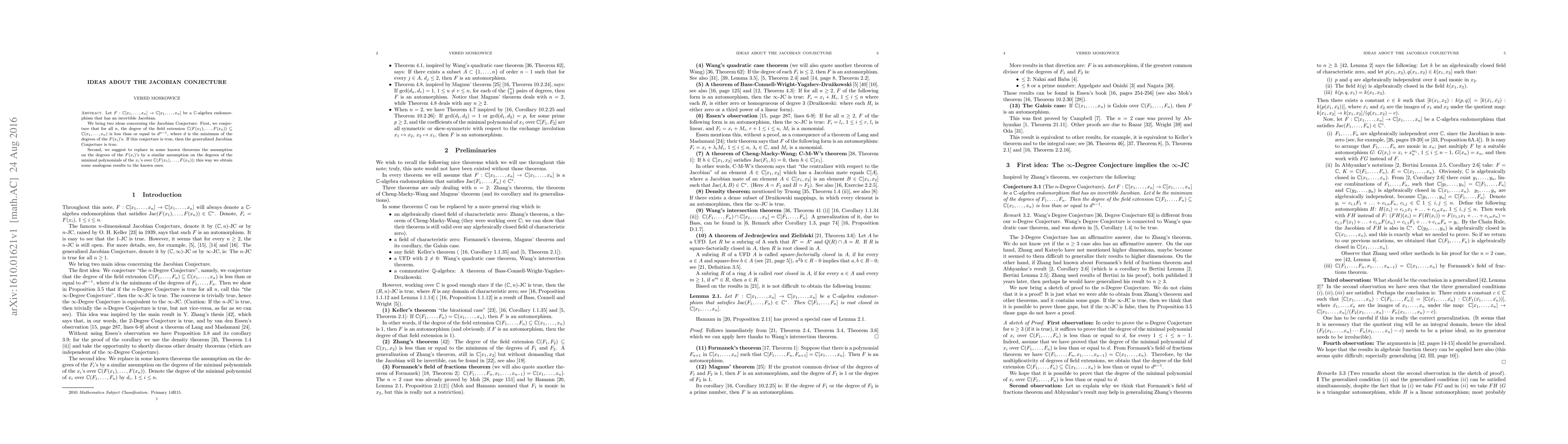 This paper proposes two ideas regarding the Jacobian Conjecture: first, it conjectures that the degree of the field extension $\mathbb{C}(F(x_1),\ldots,F(x_n)) \subseteq \mathbb{C}(x_1,\ldots,x_n)$ is bounded by $d^{n-1}$, where $d$ is the minimum degree of the $F(x_i)$'s. Second, it suggests replacing degree assumptions in known theorems with assumptions on the degrees of minimal polynomials of $x_i$'s over $\mathbb{C}(F(x_1),\ldots,F(x_n))$ to derive analogous results.