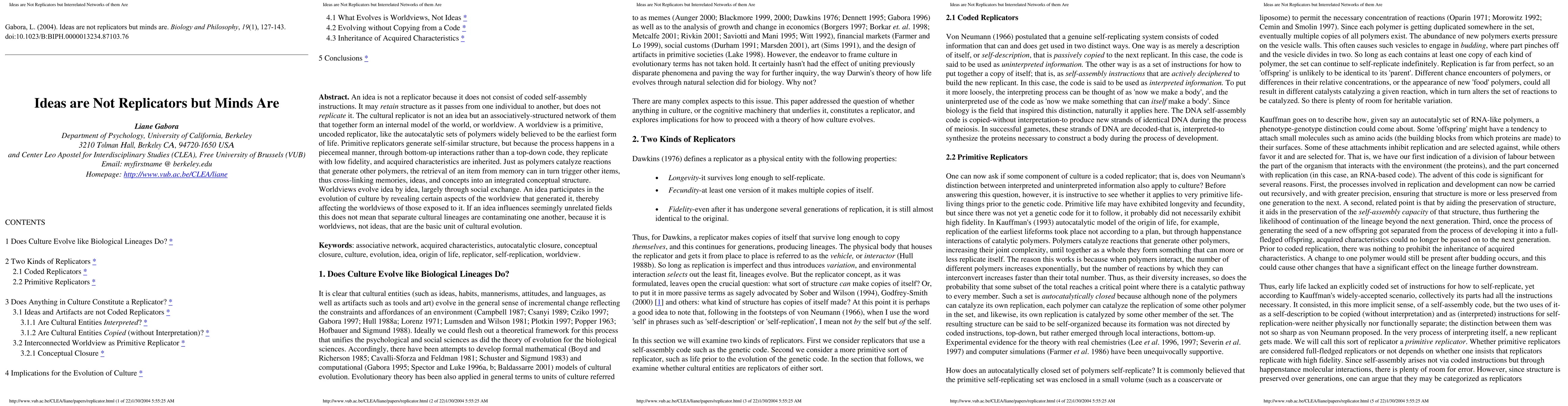 An idea is not a replicator because it does not consist of coded self-assembly instructions. It may retain structure as it passes from one individual to another, but does not replicate it. The cultural replicator is not an idea but an associatively-structured network of them that together form an internal model of the world, or worldview. A worldview is a primitive, uncoded replicator, like the autocatalytic sets of polymers widely believed to be the earliest form of life. Primitive replicators generate self-similar structure, but because the process happens in a piecemeal manner, through bottom-up interactions rather than a top-down code, they replicate with low fidelity, and acquired characteristics are inherited. Just as polymers catalyze reactions that generate other polymers, the retrieval of an item from memory can in turn trigger other items, thus cross-linking memories, ideas, and concepts into an integrated conceptual structure. Worldviews evolve idea by idea, largely through social exchange. An idea participates in the evolution of culture by revealing certain aspects of the worldview that generated it, thereby affecting the worldviews of those exposed to it. If an idea influences seemingly unrelated fields this does not mean that separate cultural lineages are contaminating one another, because it is worldviews, not ideas, that are the basic unit of cultural evolution.