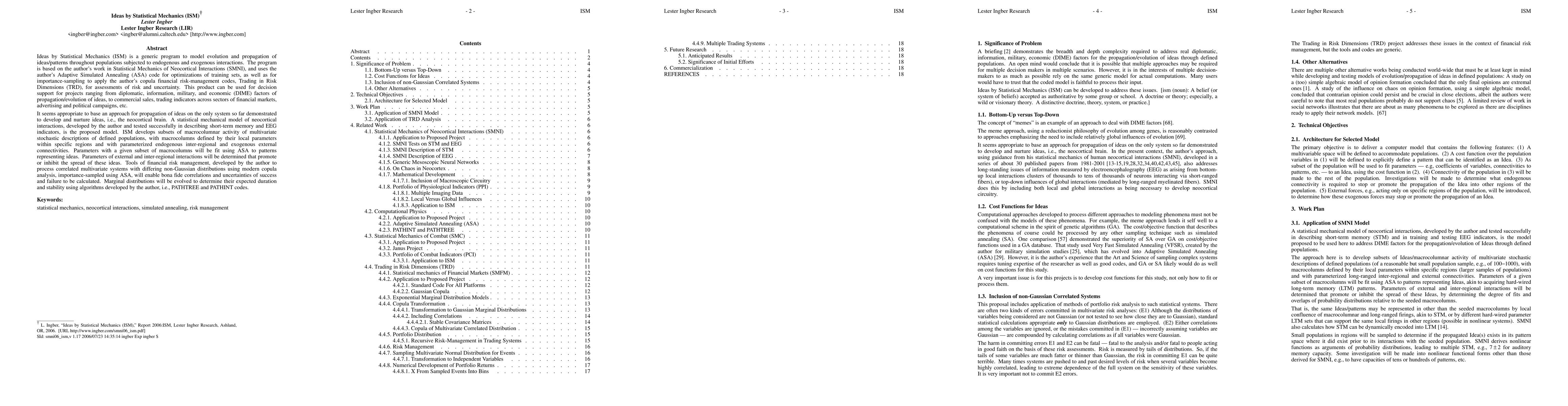 Ideas by Statistical Mechanics (ISM) is a generic program to model evolution and propagation of ideas/patterns throughout populations subjected to endogenous and exogenous interactions. The program is based on the author's work in Statistical Mechanics of Neocortical Interactions (SMNI), and uses the author's Adaptive Simulated Annealing (ASA) code for optimizations of training sets, as well as for importance-sampling to apply the author's copula financial risk-management codes, Trading in Risk Dimensions (TRD), for assessments of risk and uncertainty. This product can be used for decision support for projects ranging from diplomatic, information, military, and economic (DIME) factors of propagation/evolution of ideas, to commercial sales, trading indicators across sectors of financial markets, advertising and political campaigns, etc. A statistical mechanical model of neocortical interactions, developed by the author and tested successfully in describing short-term memory and EEG indicators, is the proposed model. Parameters with a given subset of macrocolumns will be fit using ASA to patterns representing ideas. Parameters of external and inter-regional interactions will be determined that promote or inhibit the spread of these ideas. Tools of financial risk management, developed by the author to process correlated multivariate systems with differing non-Gaussian distributions using modern copula analysis, importance-sampled using ASA, will enable bona fide correlations and uncertainties of success and failure to be calculated. Marginal distributions will be evolved to determine their expected duration and stability using algorithms developed by the author, i.e., PATHTREE and PATHINT codes.