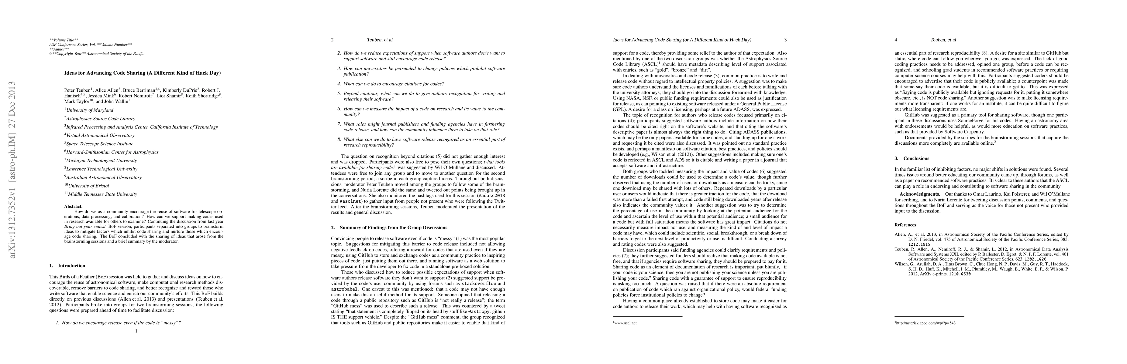 How do we as a community encourage the reuse of software for telescope operations, data processing, and calibration? How can we support making codes used in research available for others to examine? Continuing the discussion from last year Bring out your codes! BoF session, participants separated into groups to brainstorm ideas to mitigate factors which inhibit code sharing and nurture those which encourage code sharing. The BoF concluded with the sharing of ideas that arose from the brainstorming sessions and a brief summary by the moderator.