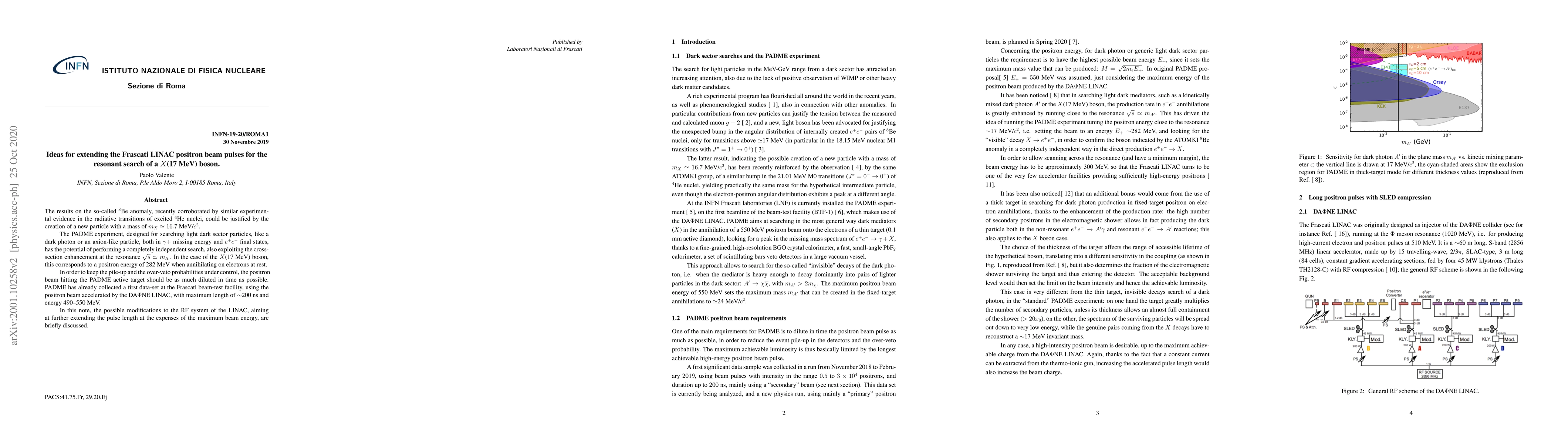 The results on the so-called $^8$Be anomaly, recently corroborated by similar experimental evidence in the radiative transitions of excited $^4$He nuclei, could be justified by the creation of a new particle with a mass of $m_X\simeq16.7$ MeV/$c^2$. The PADME experiment, designed for searching light dark sector particles, like a dark photon or an axion-like particle, both in $\gamma +$ missing energy and $e^+ e^-$ final states, has the potential of performing a completely independent search, also exploiting the cross-section enhancement at the resonance $\sqrt{s}\simeq m_X$. In the case of the $X$(17 MeV) boson, this corresponds to a positron energy of 282 MeV when annihilating on electrons at rest. In order to keep the pile-up and the over-veto probabilities under control, the positron beam hitting the PADME active target should be as much diluted in time as possible. PADME has already collected a first data-set at the Frascati beam-test facility, using the positron beam accelerated by the DA$\Phi$NE LINAC, with maximum length of $\sim$200 ns and energy 490-550 MeV. In this note, the possible modifications to the RF system of the LINAC, aiming at further extending the pulse length at the expenses of the maximum beam energy, are briefly discussed.