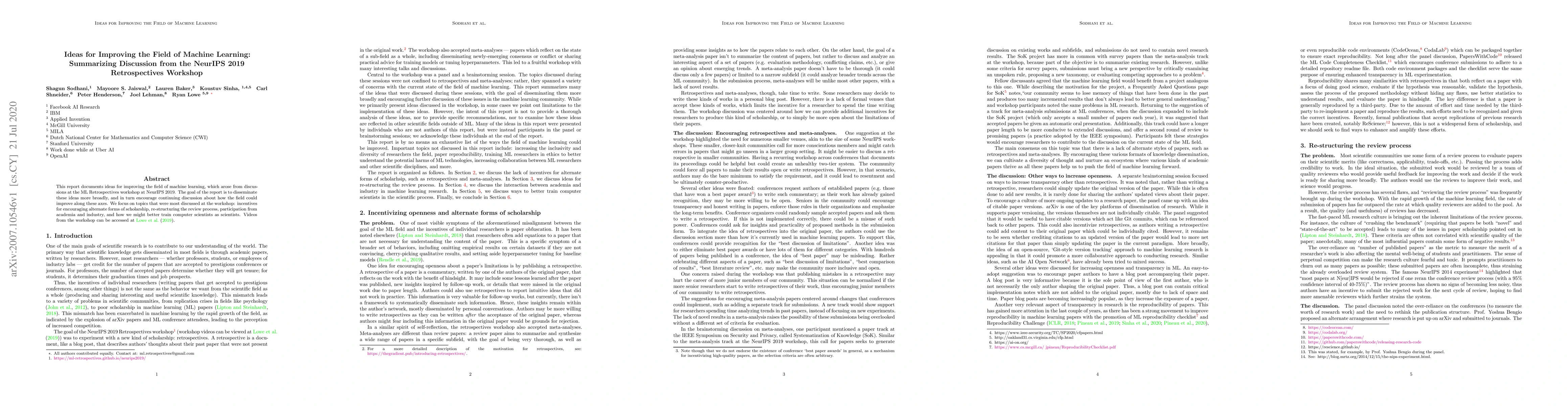 This report compiles ideas for advancing machine learning from the NeurIPS 2019 Retrospectives Workshop, focusing on incentives for diverse scholarship, restructuring the review process, enhanced academic-industry collaboration, and improved training of computer scientists. It aims to spark further discourse on these improvements.