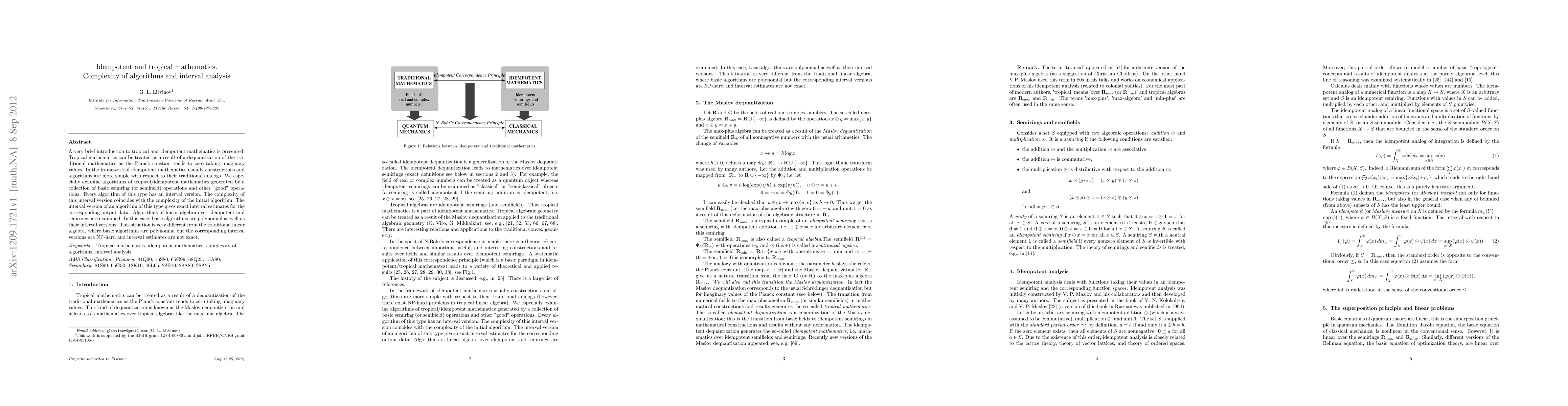 A very brief introduction to tropical and idempotent mathematics is presented. Tropical mathematics can be treated as a result of a dequantization of the traditional mathematics as the Planck constant tends to zero taking imaginary values. In the framework of idempotent mathematics usually constructions and algorithms are more simple with respect to their traditional analogs. We especially examine algorithms of tropical/idempotent mathematics generated by a collection of basic semiring (or semifield) operations and other "good" operations. Every algorithm of this type has an interval version. The complexity of this interval version coincides with the complexity of the initial algorithm. The interval version of an algorithm of this type gives exact interval estimates for the corresponding output data. Algorithms of linear algebra over idempotent and semirings are examined. In this case, basic algorithms are polynomial as well as their interval versions. This situation is very different from the traditional linear algebra, where basic algorithms are polynomial but the corresponding interval versions are NP-hard and interval estimates are not exact.