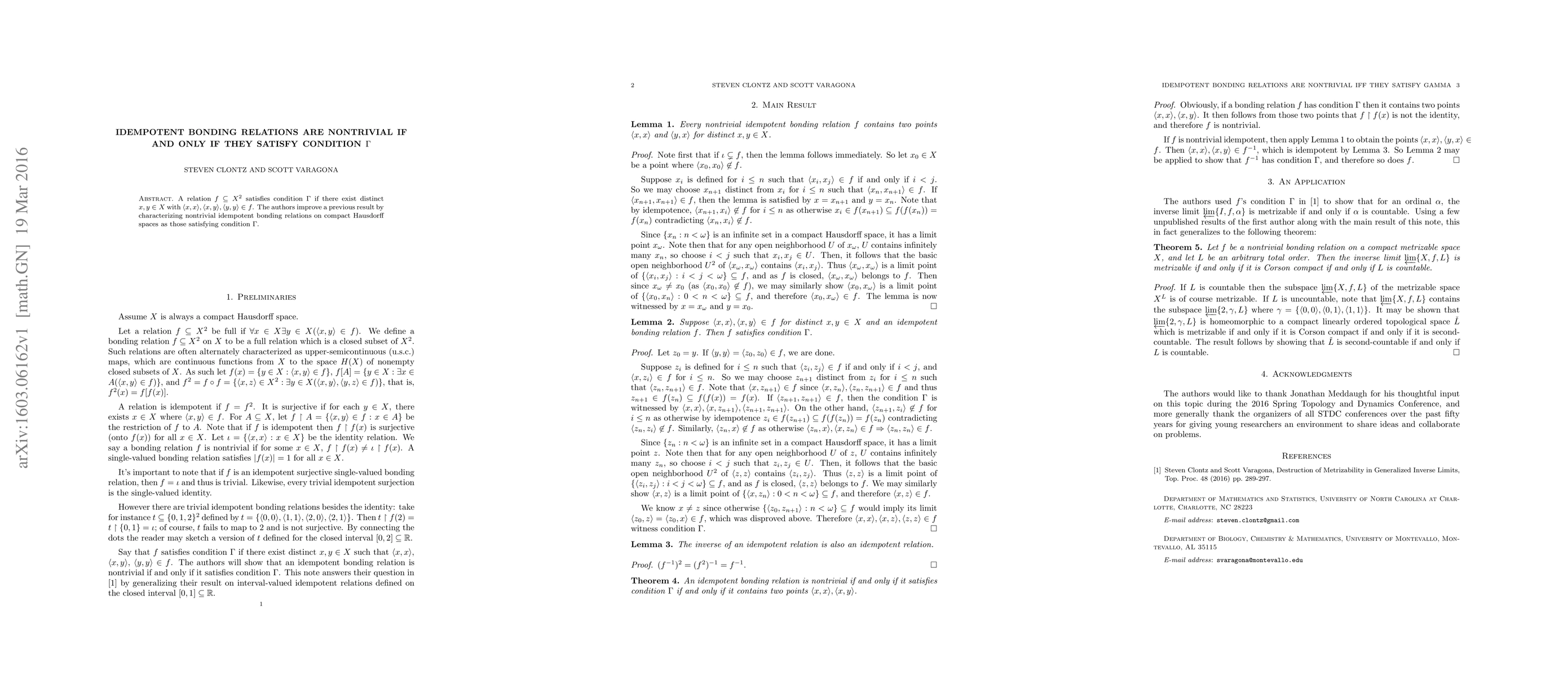 A relation $f\subseteq X^2$ satisfies condition $\Gamma$ if there exist distinct $x,y\in X$ with $\langle x,x\rangle ,\langle x,y\rangle ,\langle y,y\rangle \in f$. The authors improve a previous result by characterizing nontrivial idempotent bonding relations on compact Hausdorff spaces as those satisfying condition $\Gamma$.