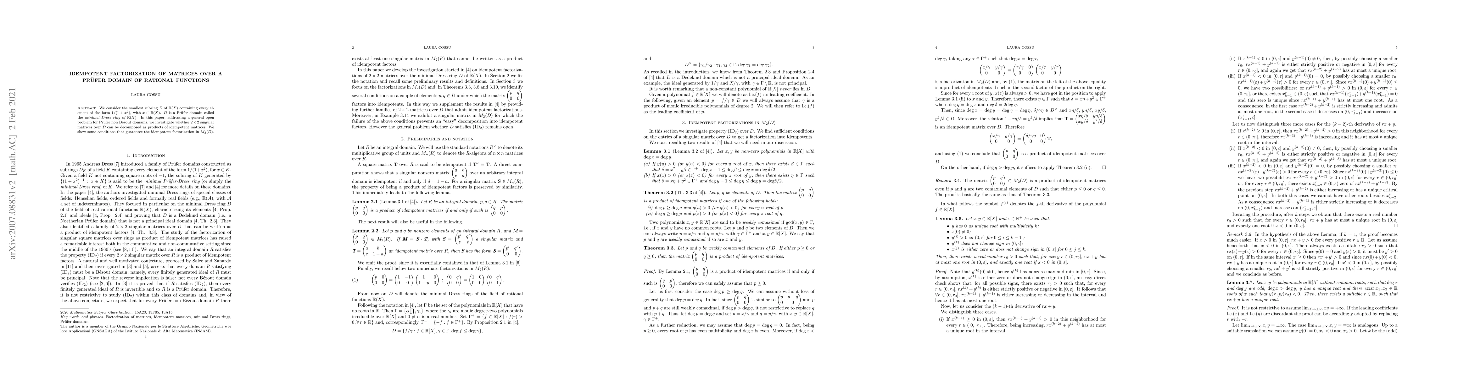 This paper explores the idempotent factorization of $2\times 2$ singular matrices over the minimal Dress ring $D$ of rational functions, a Pr\"ufer domain. It addresses an open problem by identifying conditions under which such matrices can be decomposed into products of idempotent matrices.