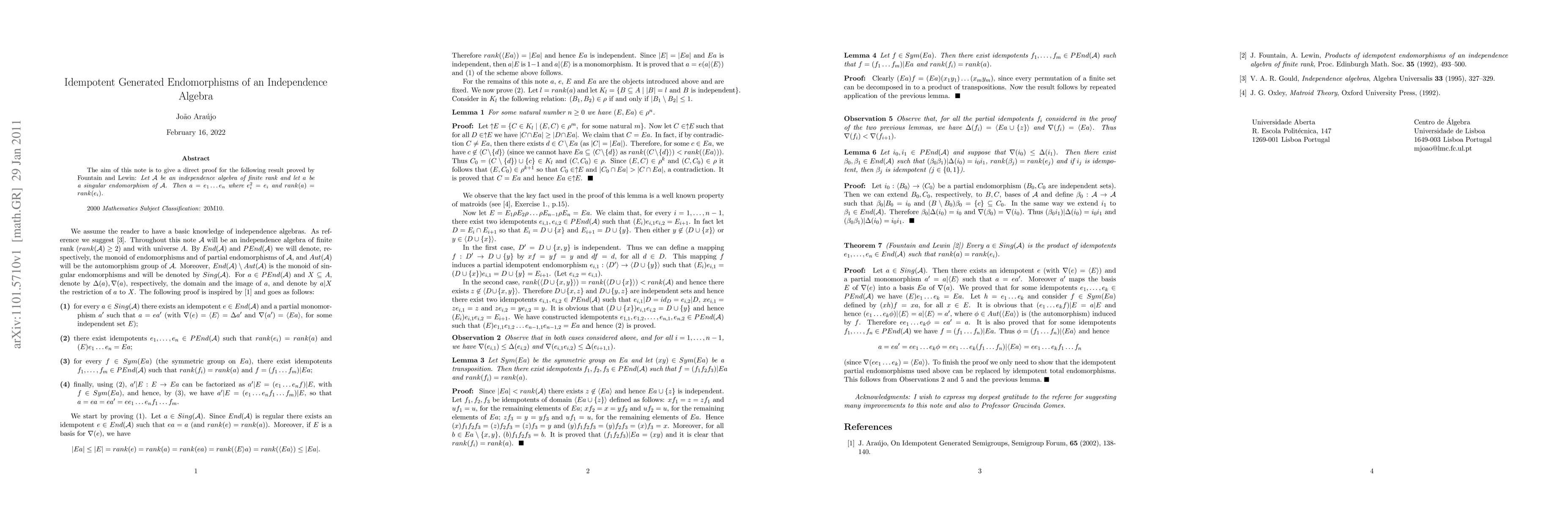 The aim of this note is to give a direct proof for the following result proved by Fountain and Lewin: {\em Let $\alg$ be an independence algebra of finite rank and let $a$ be a singular endomorphism of $\alg $. Then $a=e_1... e_n$ where $e^2_i=e_i$ and $rank(a)=rank(e_i)$.}