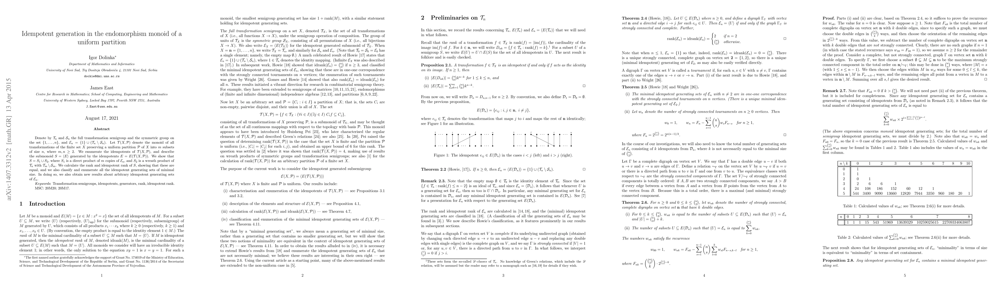 This paper enumerates the idempotents in the endomorphism monoid of a uniform partition and describes the subsemigroup generated by these idempotents. It shows that the generated subsemigroup is a union of a direct product of copies of $\mathcal E_n$ and a wreath product of $\mathcal T_n$ with $\mathcal T_m\setminus \mathcal S_m$, and calculates the rank and idempotent rank of the subsemigroup, showing they are equal.