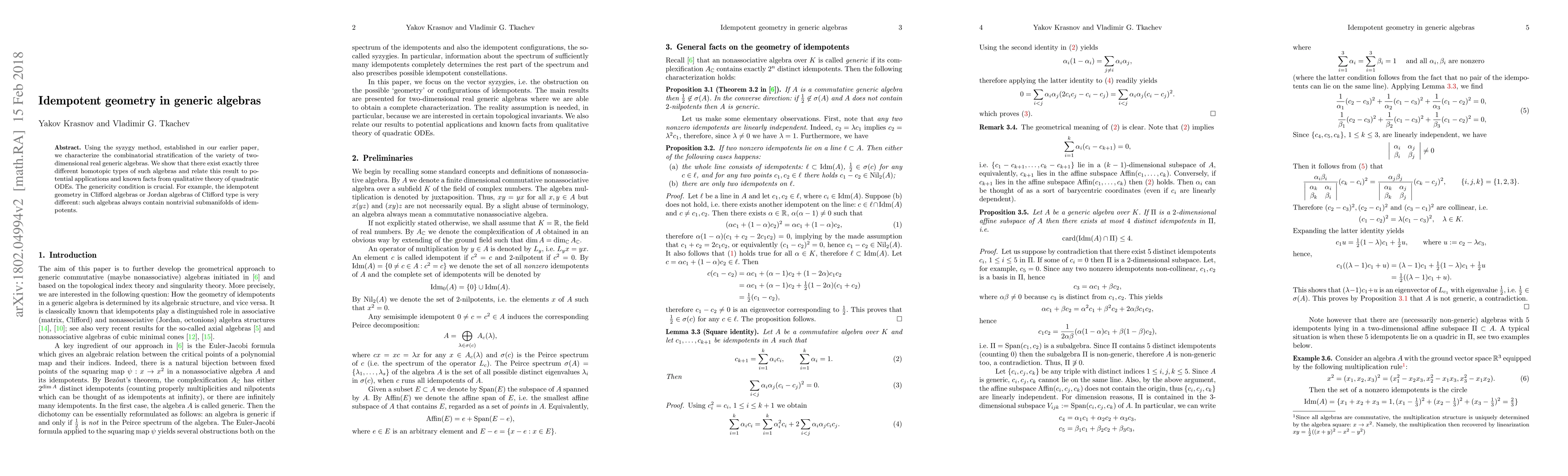Using the syzygy method, established in our earlier paper, we characterize the combinatorial stratification of the variety of two-dimensional real generic algebras. We show that there exist exactly three different homotopic types of such algebras and relate this result to potential applications and known facts from qualitative theory of quadratic ODEs. The genericity condition is crucial. For example, the idempotent geometry in Clifford algebras or Jordan algebras of Clifford type is very different: such algebras always contain nontrivial submanifolds of idempotents.