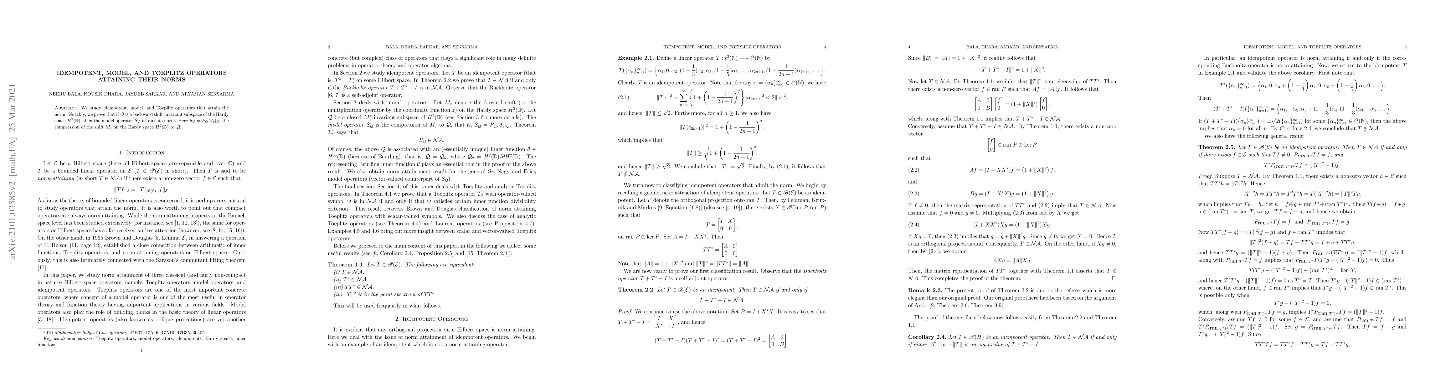 We study idempotent, model, and Toeplitz operators that attain the norm. Notably, we prove that if $\mathcal{Q}$ is a backward shift invariant subspace of the Hardy space $H^2(\mathbb{D})$, then the model operator $S_{\mathcal{Q}}$ attains its norm. Here $S_{\mathcal{Q}} = P_{\mathcal{Q}}M_z|_{\mathcal{Q}}$, the compression of the shift $M_z$ on the Hardy space $H^2(\mathbb{D})$ to $\mathcal{Q}$.