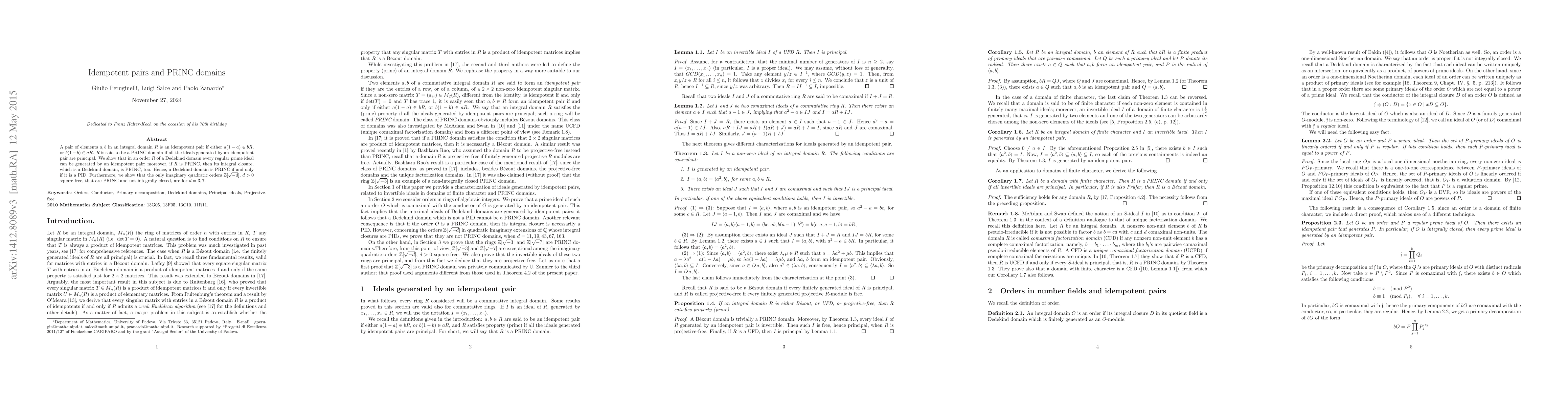 The paper explores the concept of idempotent pairs in integral domains and defines a PRINC domain where ideals generated by idempotent pairs are principal. It demonstrates that in an order of a Dedekind domain, every regular prime ideal can be generated by an idempotent pair, and if the order is PRINC, its integral closure, being a Dedekind domain, is also PRINC. The research concludes that a Dedekind domain is PRINC if and only if it is a PID.