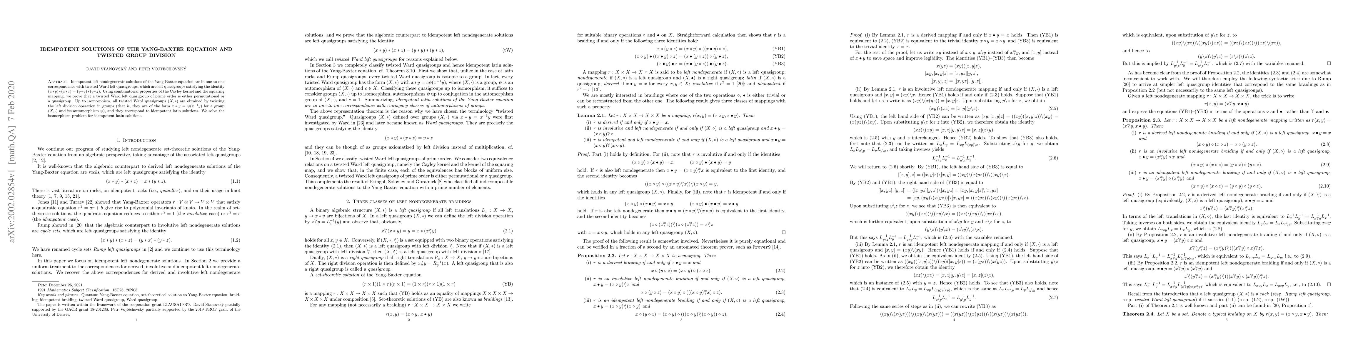 Idempotent left nondegenerate solutions of the Yang-Baxter equation are in one-to-one correspondence with twisted Ward left quasigroups, which are left quasigroups satisfying the identity $(x*y)*(x*z)=(y*y)*(y*z)$. Using combinatorial properties of the Cayley kernel and the squaring mapping, we prove that a twisted Ward left quasigroup of prime order is either permutational or a quasigroup. Up to isomorphism, all twisted Ward quasigroups $(X,*)$ are obtained by twisting the left division operation in groups (that is, they are of the form $x*y=\psi(x^{-1}y)$ for a group $(X,\cdot)$ and its automorphism $\psi$), and they correspond to idempotent latin solutions. We solve the isomorphism problem for idempotent latin solutions.
