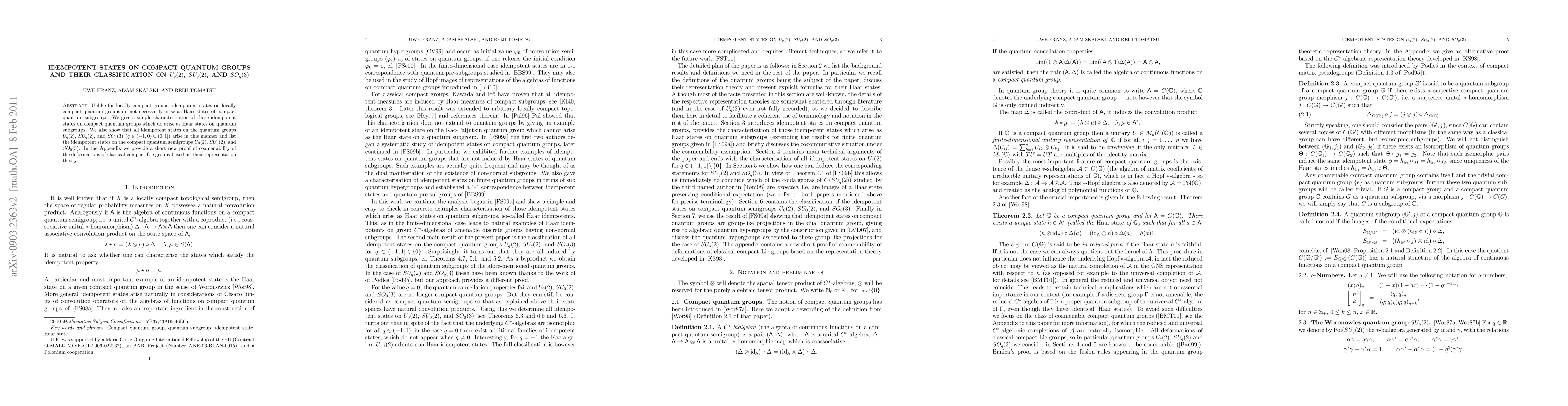 This paper characterizes idempotent states on compact quantum groups that arise as Haar states on quantum subgroups, demonstrating this for U_q(2), SU_q(2), and SO_q(3). It concludes with a proof of coamenability for these quantum groups based on their representation theory.