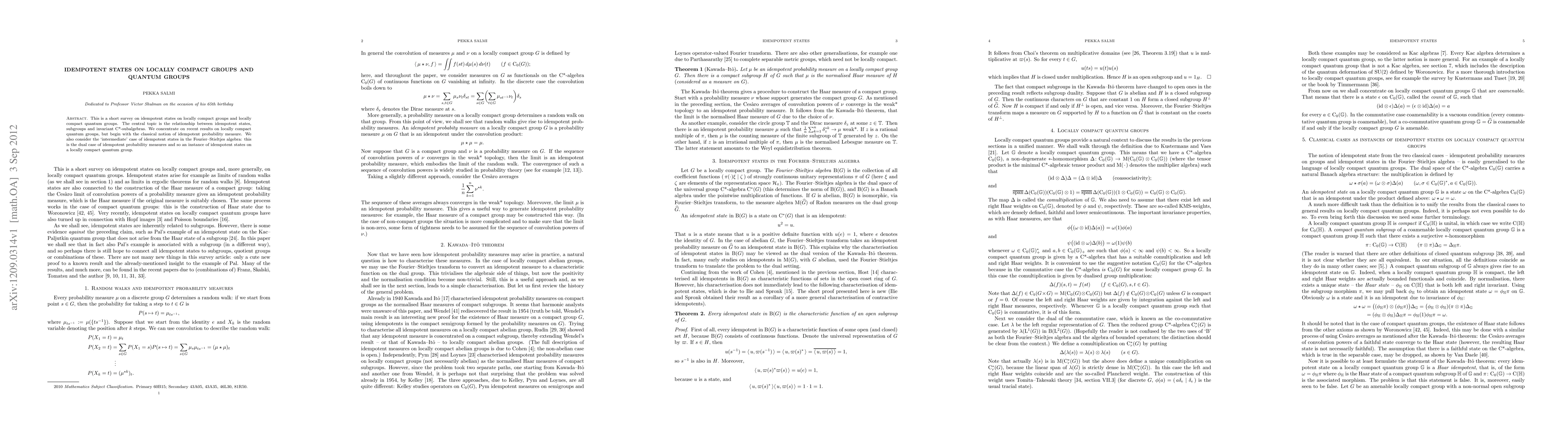 This is a short survey on idempotent states on locally compact groups and locally compact quantum groups. The central topic is the relationship between idempotent states, subgroups and invariant C*-subalgebras. We concentrate on recent results on locally compact quantum groups, but begin with the classical notion of idempotent probability measure. We also consider the `intermediate' case of idempotent states in the Fourier--Stieltjes algebra: this is the dual case of idempotent probability measures and so an instance of idempotent states on a locally compact quantum group.
